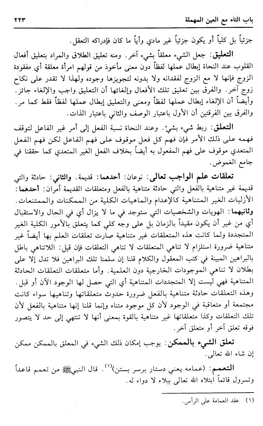 تعلقات علم الْوَاجِب تَعَالَى: نَوْعَانِ: أَحدهمَا: قديمَة. وَالثَّانِي: حَادِثَة وَالَّتِي قديمَة غير متناهية بِالْفِعْلِ وَالَّتِي حَادِثَة متناهية بِالْفِعْلِ ومتعلقات الْقَدِيمَة أَمْرَانِ: أَحدهمَا: الأزليات الْغَيْر المتناهية كالإعدام والماهيات الْكُلية من الممكنات والممتنعات. وَثَانِيهمَا: الهويات والشخصيات الَّتِي ستوجد فِي مَا لَا يزَال أَي فِي الْحَال والاستقبال أَي من غير أَن يكون مُقَيّدا بِالزَّمَانِ بل على وَجه كلي كَمَا يتَعَلَّق بالأمور الْكُلية الْغَيْر المتجددة وَلما كَانَت هَذِه المتعلقات غير متناهية صَارَت تعلقات الْعلم بهَا أَيْضا غير متناهية ضَرُورَة استلزام لَا تناهي المتعلقات لَا تناهي التعلقات فَإِن قيل: اللاتناهي بَاطِل بالبراهين المبينة فِي كتب الْمَعْقُول وَالْكَلَام قُلْنَا إِن سلمنَا تِلْكَ الْبَرَاهِين فَلَا تدل إِلَّا على بطلَان لَا تناهي الموجودات الخارجية دون العلمية. وَأما متعلقات التعلقات الْحَادِثَة المتناهية فَهِيَ لَيست إِلَّا المتجددات المتناهية أَي الَّتِي حصل لَهَا الْوُجُود الْآن أَو قبل. وَهَذِه التعلقات حَادِثَة متناهية بِالْفِعْلِ ضَرُورَة حُدُوث متعلقاتها وتناهيها سَوَاء كَانَت مجتمعة أَو متعاقبة فِي الْوُجُود لِأَن كل مَوْجُود متناه وَإِنَّمَا قُلْنَا إِنَّهَا متناهية بِالْفِعْلِ لِأَن تِلْكَ التعلقات وَكَذَا متعلقاتها غير متناهية بِالْقُوَّةِ بِمَعْنى أَنَّهَا لَا تَنْتَهِي إِلَى حد لَا يتَصَوَّر فَوْقه تعلق آخر أَو مُتَعَلق آخر.