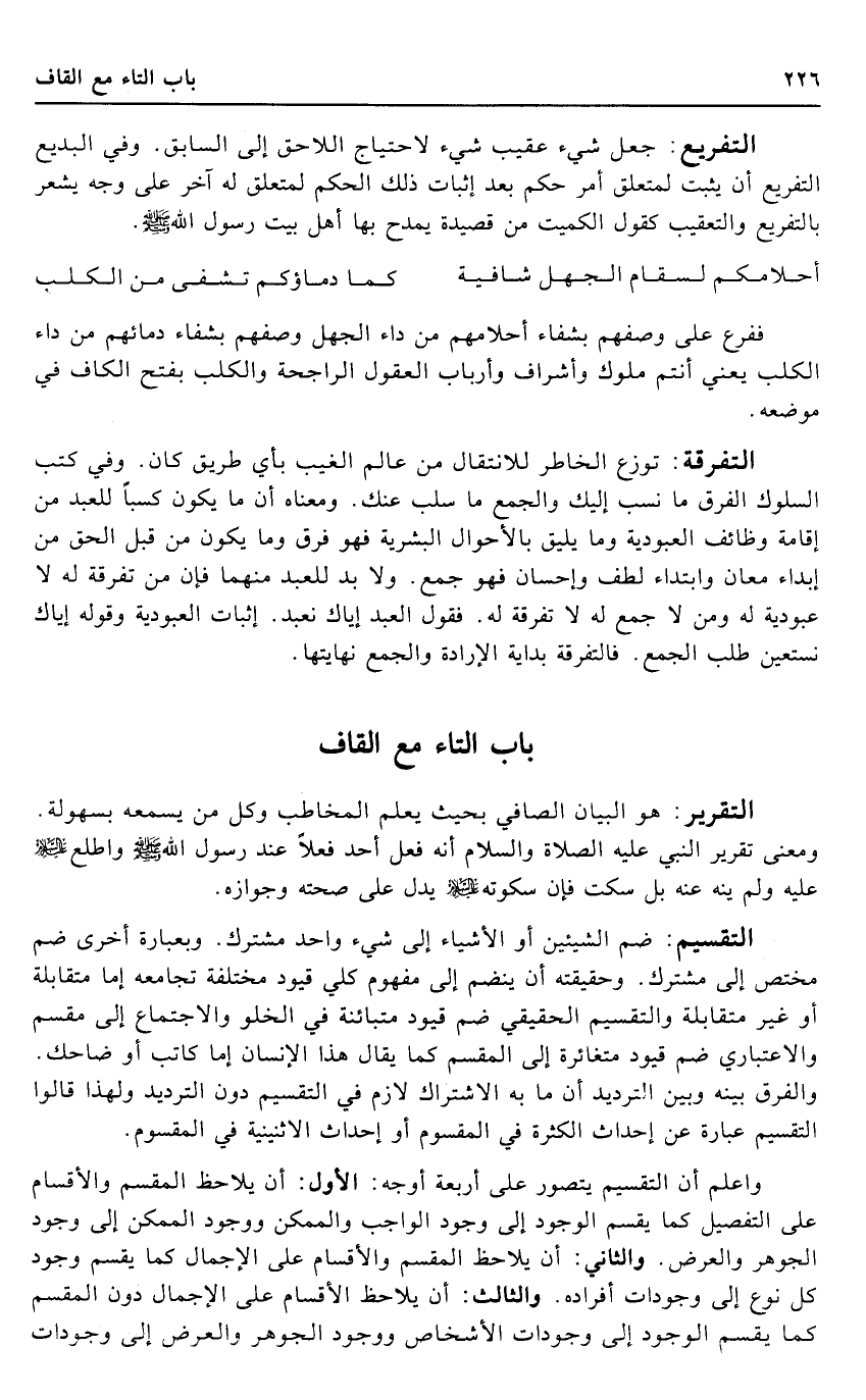 التَّفْرِيع: جعل شَيْء عقيب شَيْء لاحتياج اللَّاحِق إِلَى السَّابِق. وَفِي البديع التَّفْرِيع أَن يثبت لمتعلق أَمر حكم بعد إِثْبَات ذَلِك الحكم لمتعلق لَهُ آخر على وَجه يشْعر بالتفريع والتعقيب كَقَوْل الْكُمَيْت من قصيدة يمدح بهَا أهل بَيت رَسُول الله - صَلَّى اللَّهُ عَلَيْهِ وَسَلَّم َ -.