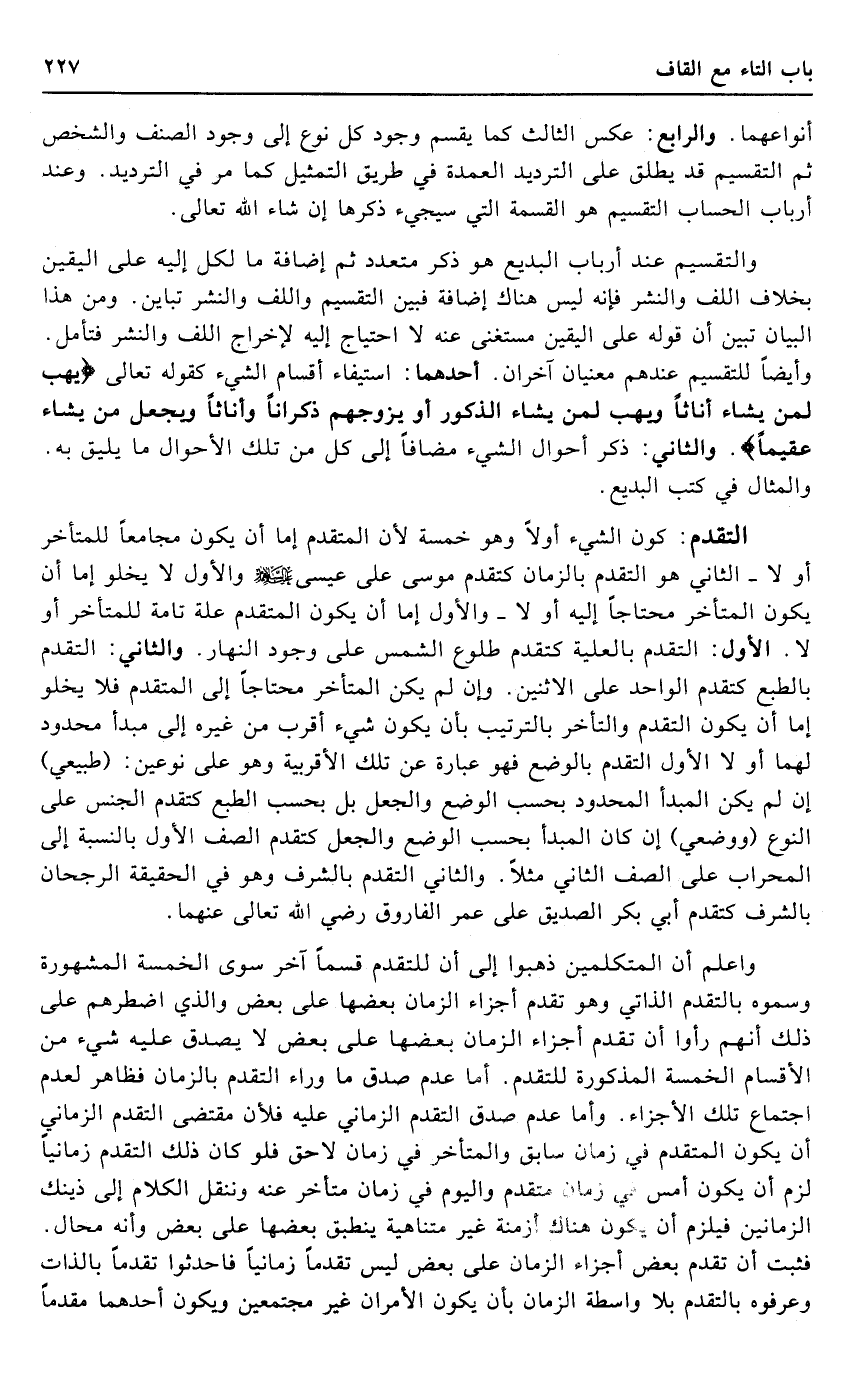 وَاعْلَم أَن الْمُتَكَلِّمين ذَهَبُوا إِلَى أَن للتقدم قسما آخر سوى الْخَمْسَة الْمَشْهُورَة وسموه بالتقدم الذاتي وَهُوَ تقدم أَجزَاء الزَّمَان بَعْضهَا على بعض وَالَّذِي اضطرهم على ذَلِك أَنهم رَأَوْا أَن تقدم أَجزَاء الزَّمَان بَعْضهَا على بعض لَا يصدق عَلَيْهِ شَيْء من الْأَقْسَام الْخَمْسَة الْمَذْكُورَة للتقدم. أما عدم صدق مَا وَرَاء التَّقَدُّم بِالزَّمَانِ فَظَاهر لعدم اجْتِمَاع تِلْكَ الْأَجْزَاء. وَأما عدم صدق التَّقَدُّم الزماني عَلَيْهِ فَلِأَن مُقْتَضى التَّقَدُّم الزماني أَن يكون الْمُتَقَدّم فِي زمَان سَابق والمتأخر فِي زمَان لَاحق فَلَو كَانَ ذَلِك التَّقَدُّم زمانيا لزم أَن يكون أمس فِي زمَان مُتَقَدم وَالْيَوْم فِي زمَان مُتَأَخّر عَنهُ وننقل الْكَلَام إِلَى ذَيْنك الزمانين فَيلْزم أَن يكون هُنَاكَ أزمنة غير متناهية ينطبق بَعْضهَا على بعض وَأَنه محَال. فَثَبت أَن تقدم بعض أَجزَاء الزَّمَان على بعض لَيْسَ تقدما زمانيا فاحدثوا تقدما بِالذَّاتِ وعرفوه بالتقدم بِلَا وَاسِطَة الزَّمَان بِأَن يكون الْأَمْرَانِ غير مُجْتَمعين وَيكون أَحدهمَا مقدما