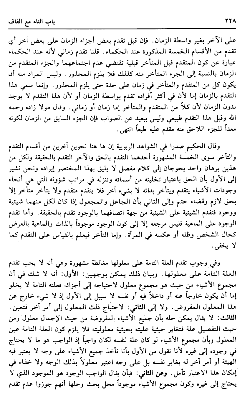 على الآخر بِغَيْر وَاسِطَة الزَّمَان. فَإِن قيل تقدم بعض أَجزَاء الزَّمَان على بعض آخر أَي تقدم من الْأَقْسَام الْخَمْسَة الْمَذْكُورَة عِنْد الْحُكَمَاء. قُلْنَا تقدم زماني لِأَنَّهُ عِنْد الْحُكَمَاء عبارَة عَن كَون الْمُتَقَدّم قبل الْمُتَأَخر قبلية تَقْتَضِي عدم اجْتِمَاعهمَا والجزء الْمُتَقَدّم من الزَّمَان بِالنِّسْبَةِ إِلَى الْجُزْء الْمُتَأَخر مِنْهُ كَذَلِك فَلَا يلْزم الْمَحْذُور. وَلَيْسَ المُرَاد مِنْهُ أَن يكون كل من الْمُتَقَدّم والمتأخر فِي زمَان على حِدة حَتَّى يلْزم الْمَحْذُور. وَإِنَّمَا سمي هَذَا التَّقَدُّم بِالزَّمَانِ إِمَّا لِأَن فِي أَكثر أَفْرَاده تقدم بِوَاسِطَة الزَّمَان أَو لِأَن هَذَا التَّقَدُّم لَا يُوجد بِدُونِ الزَّمَان لِأَن كلا من الْمُتَقَدّم والمتأخر إِمَّا زمَان أَو زماني. وَقَالَ مولا زَاده رَحمَه الله وَقيل هَذَا التَّقَدُّم طبيعي وَلَيْسَ بِبَعِيد عَن الصَّوَاب فَإِن الْجُزْء السَّابِق من الزَّمَان لكَونه معدا للجزء اللَّاحِق مِنْهُ مقدم عَلَيْهِ طبعا انْتهى.