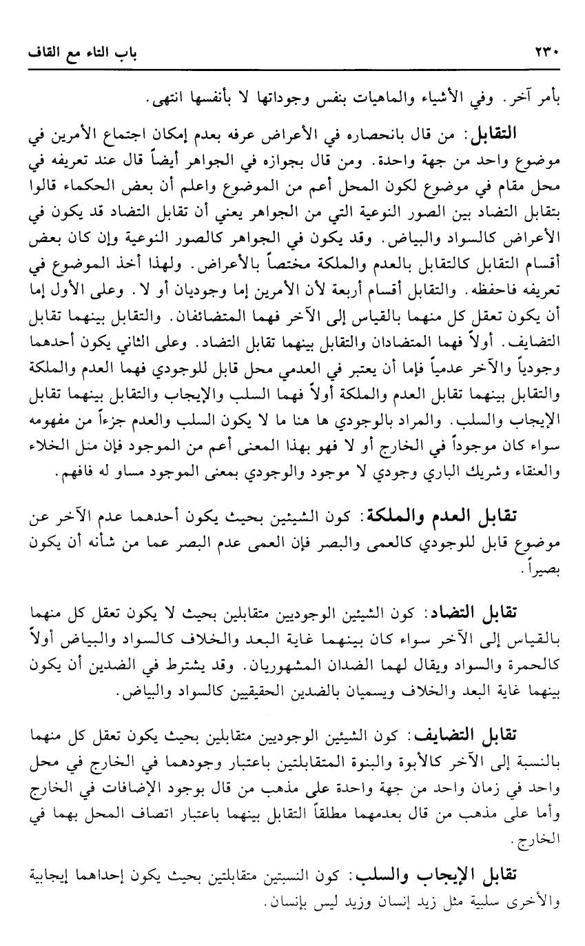 التقابل: من قَالَ بانحصاره فِي الْأَعْرَاض عرفه بِعَدَمِ إِمْكَان اجْتِمَاع الْأَمريْنِ فِي مَوْضُوع وَاحِد من جِهَة وَاحِدَة. وَمن قَالَ بِجَوَازِهِ فِي الْجَوَاهِر أَيْضا قَالَ عِنْد تَعْرِيفه فِي مَحل مقَام فِي مَوْضُوع لكَون الْمحل أَعم من الْمَوْضُوع وَاعْلَم أَن بعض الْحُكَمَاء قَالُوا بتقابل التضاد بَين الصُّور النوعية الَّتِي من الْجَوَاهِر يَعْنِي أَن تقَابل التضاد قد يكون فِي الْأَعْرَاض كالسواد وَالْبَيَاض. وَقد يكون فِي الْجَوَاهِر كالصور النوعية وَإِن كَانَ بعض أَقسَام التقابل كالتقابل بِالْعدمِ والملكة مُخْتَصًّا بالأعراض. وَلِهَذَا أَخذ الْمَوْضُوع فِي تَعْرِيفه فاحفظه. والتقابل أَقسَام أَرْبَعَة لِأَن الْأَمريْنِ إِمَّا وجوديان أَو لَا. وعَلى الأول إِمَّا أَن يكون تعقل كل مِنْهُمَا بِالْقِيَاسِ إِلَى الآخر فهما المتضائفان. والتقابل بَينهمَا تقَابل التضايف. أَولا فهما المتضادان والتقابل بَينهمَا تقَابل التضاد. وعَلى الثَّانِي يكون أَحدهمَا وجوديا وَالْآخر عدميا فإمَّا أَن يعْتَبر فِي العدمي مَحل قَابل للوجودي فهما الْعَدَم والملكة والتقابل بَينهمَا تقَابل الْعَدَم والملكة أَولا فهما السَّلب والإيجاب والتقابل بَينهمَا تقَابل الْإِيجَاب وَالسَّلب. وَالْمرَاد بالوجودي هَا هُنَا مَا لَا يكون السَّلب والعدم جُزْءا من مَفْهُومه سَوَاء كَانَ مَوْجُودا فِي الْخَارِج أَو لَا فَهُوَ بِهَذَا الْمَعْنى أَعم من الْمَوْجُود فَإِن مثل الْخَلَاء والعنقاء وَشريك الْبَارِي وجودي لَا مَوْجُود والوجودي بِمَعْنى الْمَوْجُود مسَاوٍ لَهُ فَافْهَم.