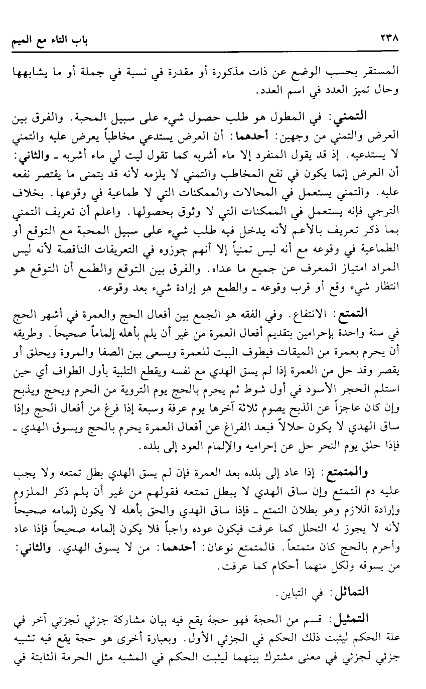 التَّمَنِّي: فِي المطول هُوَ طلب حُصُول شَيْء على سَبِيل الْمحبَّة. وَالْفرق بَين الْعرض وَالتَّمَنِّي من وَجْهَيْن: أَحدهمَا: أَن الْعرض يَسْتَدْعِي مُخَاطبا يعرض عَلَيْهِ وَالتَّمَنِّي لَا يستدعيه. إِذْ قد يَقُول الْمُنْفَرد إِلَّا مَاء أشربه كَمَا تَقول لَيْت لي مَاء أشربه - وَالثَّانِي: أَن الْعرض إِنَّمَا يكون فِي نفع الْمُخَاطب وَالتَّمَنِّي لَا يلْزمه لِأَنَّهُ قد يتَمَنَّى مَا يقْتَصر نَفعه عَلَيْهِ. وَالتَّمَنِّي يسْتَعْمل فِي المحالات والممكنات الَّتِي لَا طماعية فِي وُقُوعهَا. بِخِلَاف الترجي فَإِنَّهُ يسْتَعْمل فِي الممكنات الَّتِي لَا وثوق بحصولها. وَاعْلَم أَن تَعْرِيف التَّمَنِّي بِمَا ذكر تَعْرِيف بالأعم لِأَنَّهُ يدْخل فِيهِ طلب شَيْء على سَبِيل الْمحبَّة مَعَ التوقع أَو الطماعية فِي وُقُوعه مَعَ أَنه لَيْسَ تمنيا إِلَّا أَنهم جوزوه فِي التعريفات النَّاقِصَة لِأَنَّهُ لَيْسَ المُرَاد امتياز الْمُعَرّف عَن جَمِيع مَا عداهُ. وَالْفرق بَين التوقع والطمع أَن التوقع هُوَ انْتِظَار شَيْء وَقع أَو قرب وُقُوعه - والطمع هُوَ إِرَادَة شَيْء بعد وُقُوعه.