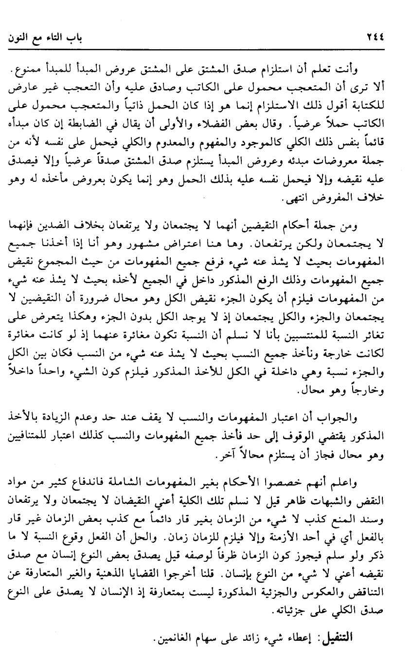وَمن جملَة أَحْكَام النقيضين أَنَّهُمَا لَا يَجْتَمِعَانِ وَلَا يرتفعان بِخِلَاف الضدين فَإِنَّهُمَا لَا يَجْتَمِعَانِ وَلَكِن يرتفعان. وَهَا هُنَا اعْتِرَاض مَشْهُور وَهُوَ أَنا إِذا أَخذنَا جَمِيع المفهومات بِحَيْثُ لَا يشذ عَنهُ شَيْء فَرفع جَمِيع المفهومات من حَيْثُ الْمَجْمُوع نقيض جَمِيع المفهومات وَذَلِكَ الرّفْع الْمَذْكُور دَاخل فِي الْجَمِيع لأَخذه بِحَيْثُ لَا يشذ عَنهُ شَيْء من المفهومات فَيلْزم أَن يكون الْجُزْء نقيض الْكل وَهُوَ محَال ضَرُورَة أَن النقيضين لَا يَجْتَمِعَانِ والجزء وَالْكل يَجْتَمِعَانِ إِذْ لَا يُوجد الْكل بِدُونِ الْجُزْء وَهَكَذَا يتَعَرَّض على تغائر النِّسْبَة للمنتسبين بِأَنا لَا نسلم أَن النِّسْبَة تكون مغائرة عَنْهُمَا إِذْ لَو كَانَت مغائرة لكَانَتْ خَارِجَة ونأخذ جَمِيع النّسَب بِحَيْثُ لَا يشذ عَنهُ شَيْء من النّسَب فَكَانَ بَين الْكل والجزء نِسْبَة وَهِي دَاخِلَة فِي الْكل للأخذ الْمَذْكُور فَيلْزم كَون الشَّيْء وَاحِدًا دَاخِلا وخارجا وَهُوَ محَال.