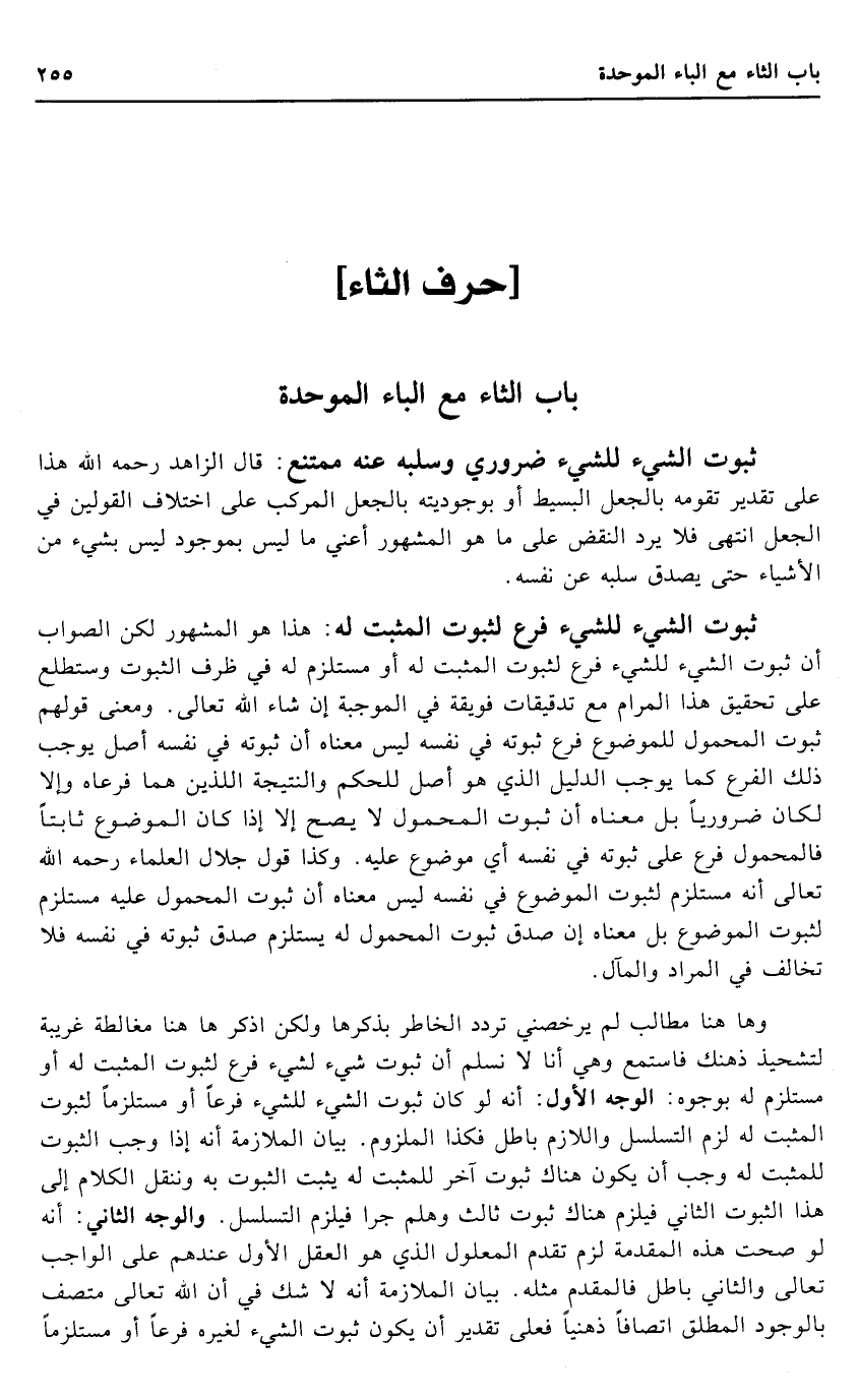ثُبُوت الشَّيْء للشَّيْء فرع لثُبُوت الْمُثبت لَهُ: هَذَا هُوَ الْمَشْهُور لَكِن الصَّوَاب أَن ثُبُوت الشَّيْء للشَّيْء فرع لثُبُوت الْمُثبت لَهُ أَو مُسْتَلْزم لَهُ فِي ظرف الثُّبُوت وستطلع على تَحْقِيق هَذَا المرام مَعَ تدقيقات فويقة فِي الْمُوجبَة إِن شَاءَ الله تَعَالَى. وَمعنى قَوْلهم ثُبُوت الْمَحْمُول للموضوع فرع ثُبُوته فِي نَفسه لَيْسَ مَعْنَاهُ أَن ثُبُوته فِي نَفسه أصل يُوجب ذَلِك الْفَرْع كَمَا يُوجب الدَّلِيل الَّذِي هُوَ أصل للْحكم والنتيجة اللَّذين هما فرعاه وَإِلَّا لَكَانَ ضَرُورِيًّا بل مَعْنَاهُ أَن ثُبُوت الْمَحْمُول لَا يَصح إِلَّا إِذا كَانَ الْمَوْضُوع ثَابتا فالمحمول فرع على ثُبُوته فِي نَفسه أَي مَوْضُوع عَلَيْهِ. وَكَذَا قَول جلال الْعلمَاء رَحمَه الله تَعَالَى أَنه مُسْتَلْزم لثُبُوت الْمَوْضُوع فِي نَفسه لَيْسَ مَعْنَاهُ أَن ثُبُوت الْمَحْمُول عَلَيْهِ مُسْتَلْزم لثُبُوت الْمَوْضُوع بل مَعْنَاهُ إِن صدق ثُبُوت الْمَحْمُول لَهُ يسْتَلْزم صدق ثُبُوته فِي نَفسه فَلَا تخَالف فِي المُرَاد والمآل.