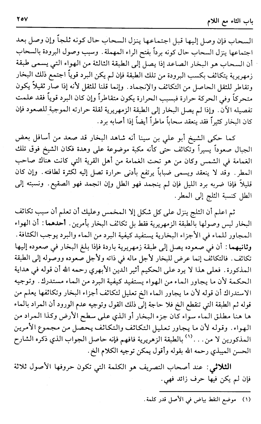 ثمَّ اعْلَم أَن الثَّلج ينزل على كل شكل إِلَّا المخمس وَعَلَيْك أَن تعلم أَن سَبَب تكاثف البخار لَيْسَ وصولها بالطبقة الزمهريرية فَقَط بل تكاثف البخار بأمرين: أَحدهمَا: أَن الْهَوَاء المجاور للْمَاء فِي الْأَجْزَاء البخارية يَسْتَفِيد كَيْفيَّة الْبرد من المَاء وَالْبرد يُوجب الكثافة. وَثَانِيهمَا: أَن فِي صُعُوده يصل إِلَى طبقَة زمهريرية بَارِدَة فَإِذا بلغ البخار فِي صُعُوده إِلَيْهَا تكاثف. فالتكاثف إِنَّمَا عرض للبخار لأجل مَاله فِي ذَاته وَلأَجل صُعُوده ووصوله إِلَى الطَّبَقَة الْمَذْكُورَة. فعلى هَذَا لَا يرد على الْحَكِيم أثير الدّين الْأَبْهَرِيّ رَحمَه الله أَن قَوْله فِي هِدَايَة الْحِكْمَة لِأَن مَا يجاور المَاء من الْهَوَاء يَسْتَفِيد كَيْفيَّة الْبرد من المَاء مُسْتَدْرك. وتوجيه الِاسْتِدْرَاك أَن قَوْله لِأَن مَا يجاور المَاء الخ تَعْلِيل لتكاثف أَجزَاء البخار وتكاثفها يعلم من قَوْله ثمَّ الطَّبَقَة الَّتِي تَنْقَطِع الخ فَلَا حَاجَة إِلَى ذَلِك القَوْل وتوجيه عدم الْوُرُود أَن المُرَاد بِالْمَاءِ هَا هُنَا مُطلق المَاء سَوَاء كَانَ جُزْء البخار أَو الَّذِي على سطح الأَرْض وَكَذَا المُرَاد من الْهَوَاء. وَقَوله لِأَن مَا يجاور تَعْلِيل التكاثف والتكاثف يحصل من مَجْمُوع الْأَمريْنِ الْمَذْكُورين لَا من ... بالطبقة الزهريرية فَافْهَم فَإِنَّهُ حَاصِل الْجَواب الَّذِي ذكره الشَّارِح الْحسن الميبذي رَحمَه الله بقوله وَأَقُول يُمكن تَوْجِيه الْكَلَام الخ.