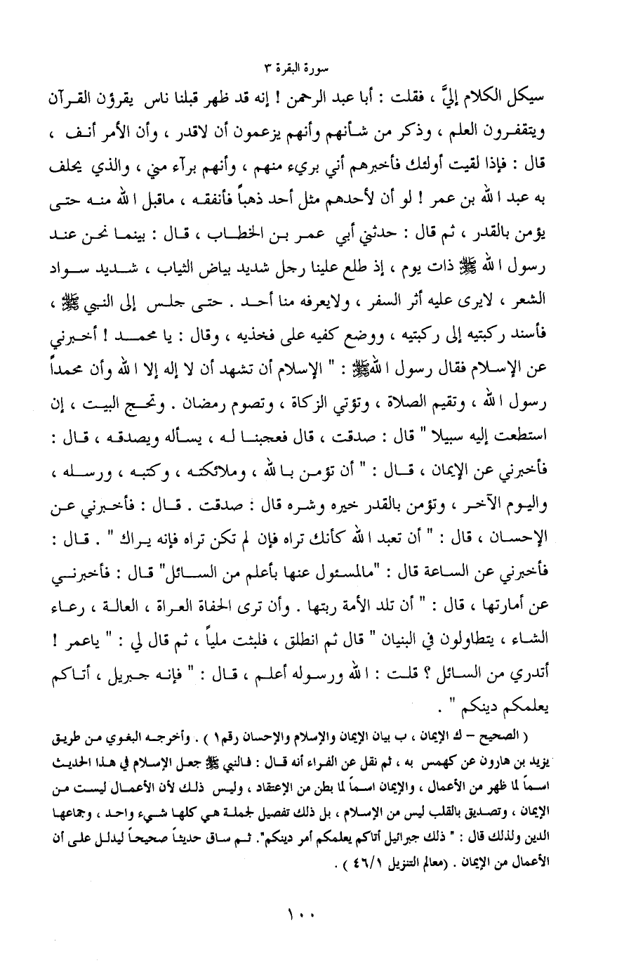 سيكل الكلام إليَّ. فقلت: أبا عبد الرحمن! إنه قد ظهر قبلنا ناس يقرؤون القرآن ويتقفرون العلم، وذكر من شأنهم وأنهم يزعمون أن لا قدر. وأن الأمر أنف. قال: فإذا لقيت أولئك فأخبرهم أني بريء منهم، وأنهم برآء مني. والذي يحلف به عبد الله بن عمر! لو أن لأحدهم مثل أحد ذهبا فأنفقه، ما قبل الله منه حتى يؤمن بالقدر ثم قال: حدثني أبي عمر بن الخطاب، قال: بينما نحن عند رسول الله صَلَّى اللَّهُ عَلَيْهِ وَسَلَّمَ ذات يوم، إذ طلع علينا رجل شديد بياض الثياب، شديد سواد الشعر. لا يرى عليه أثر السفر، ولا يعرفه منا أحد. حتى جلس إلى النبي صَلَّى اللَّهُ عَلَيْهِ وَسَلَّمَ، فأسند ركبتيه إلى ركبتيه. ووضع كفيه على فخذيه. وقال: يا محمد! أخبرني عن الإسلام فقال رسول الله صَلَّى اللَّهُ عَلَيْهِ وَسَلَّمَ: "الإسلام أن تشهد أن لا إله إلا الله وأن محمداً رسول الله، وتقيم الصلاة، وتؤتي الزكاة، وتصوم رمضان، وتحج البيت إن استطعت إليه سبيلا" قال: صدقت، فعجبنا له، يسأله ويصدقه. قال: فأخبرني عن الإِيمان، قال: "أن تؤمن بالله، وملائكته، وكتبه، ورسله، واليوم الآخر، وتؤمن بالقدر خيره وشره" قال: صدقت. قال: فأخبرني عن الإِحسان، قال: "أن تعبد الله كأنك تراه فإن لم تكن تراه فإنه يراك". قال: فأخبرني عن الساعة قال: "ما المسئول عنها بأعلم من السائل" قال: فأخبرني عن أمارتها، قال: "أن تلد الأمة ربتها. وأن ترى الحفاة العراة، العالة، رعاء الشاء، يتطاولون في البنيان" قال ثم انطلق، فلبثت مليا، ثم قال لي: "يا عمر! أتدري من السائل؟ قلت: الله ورسوله أعلم، قال: "فإنه جبريل، أتاكم يعلمكم دينكم".