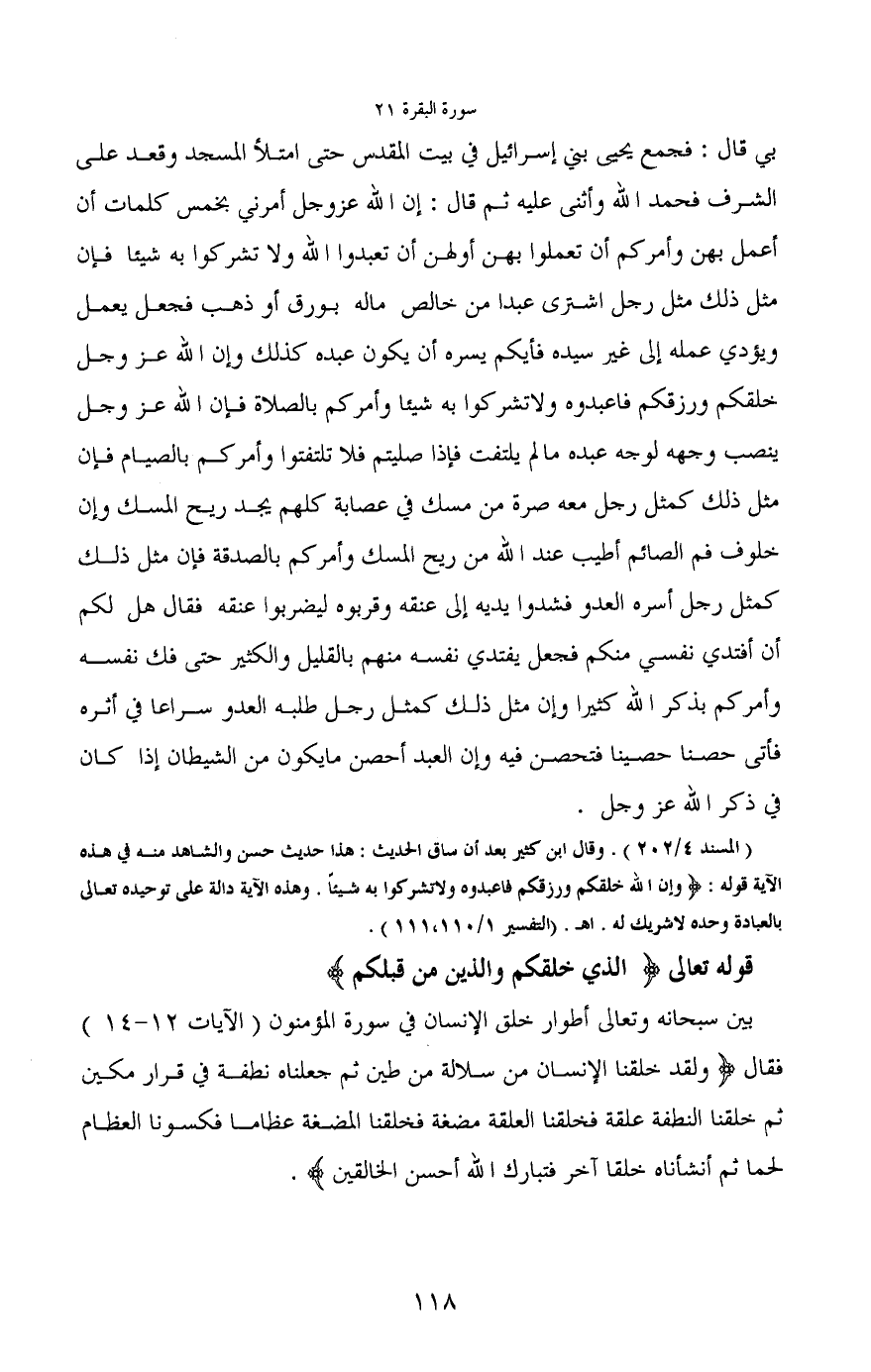 ((المسند رقم 4/202) . وقال ابن كثير بعد أن ساق الحديث: هذا حديث حسن والشاهد منه في هذه الآية قوله: (وإن الله خلقكم ورزقكم فاعبدوه ولا تشركوا به شيئاً) ، وهذه الآية دالة على توحيده تعالى بالعبادة وحده لا شريك له. ا. هـ التفسير (1/110، 111)) .
