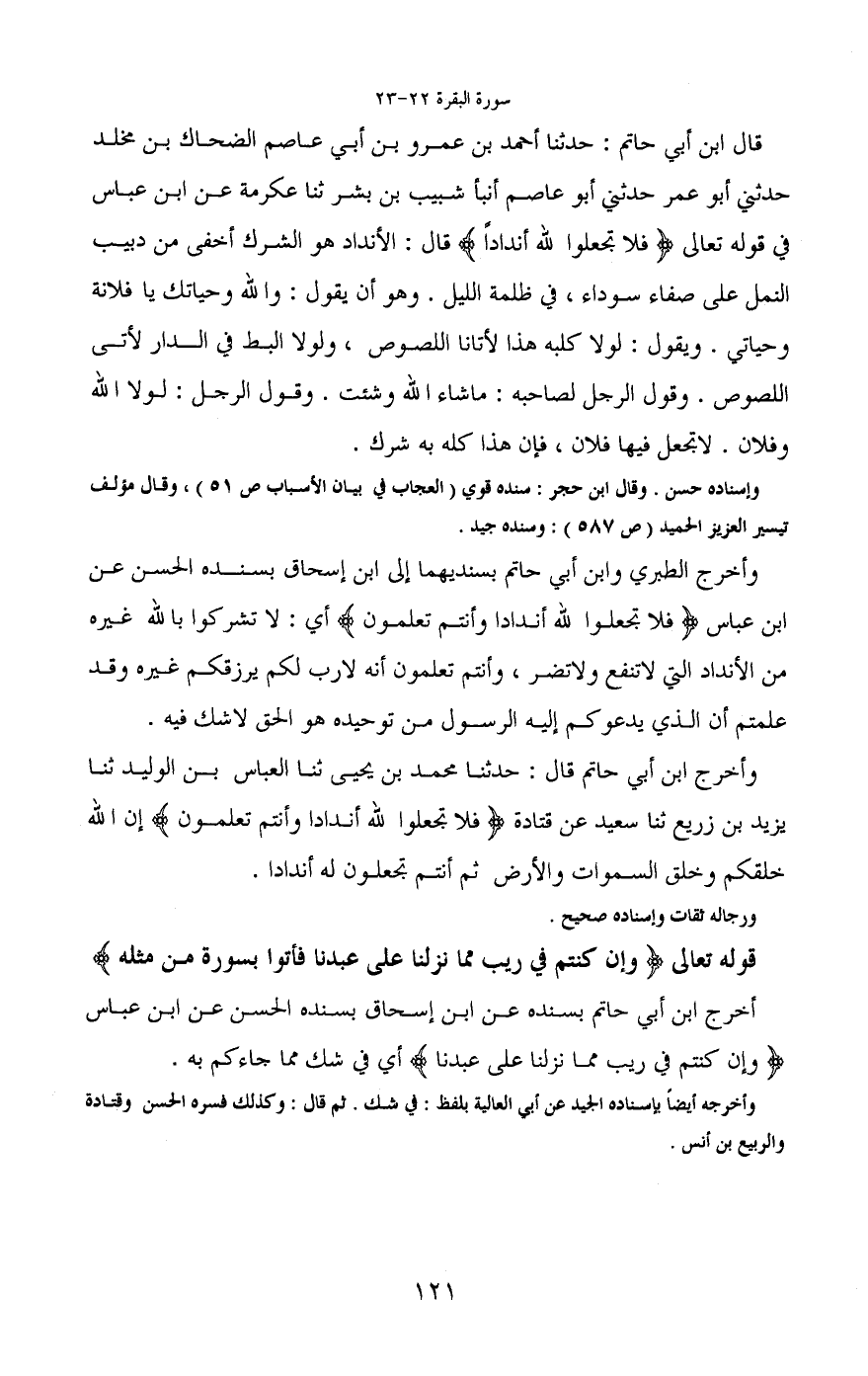 وأخرج الطبري وابن أبي حاتم بسنديهما إلى ابن إسحاق بسنده الحسن عن ابن عباس (فلا تجعلوا لله أندادا وأنتم تعلمون) أي: لا تشركوا بالله غيره من الأنداد التي لا تنفع ولا تضر، وأنتم تعلمون أنه لا رب لكم يرزقكم غيره وقد علمتم أن الذي يدعوكم إليه الرسول من توحيده هو الحق لاشك فيه.