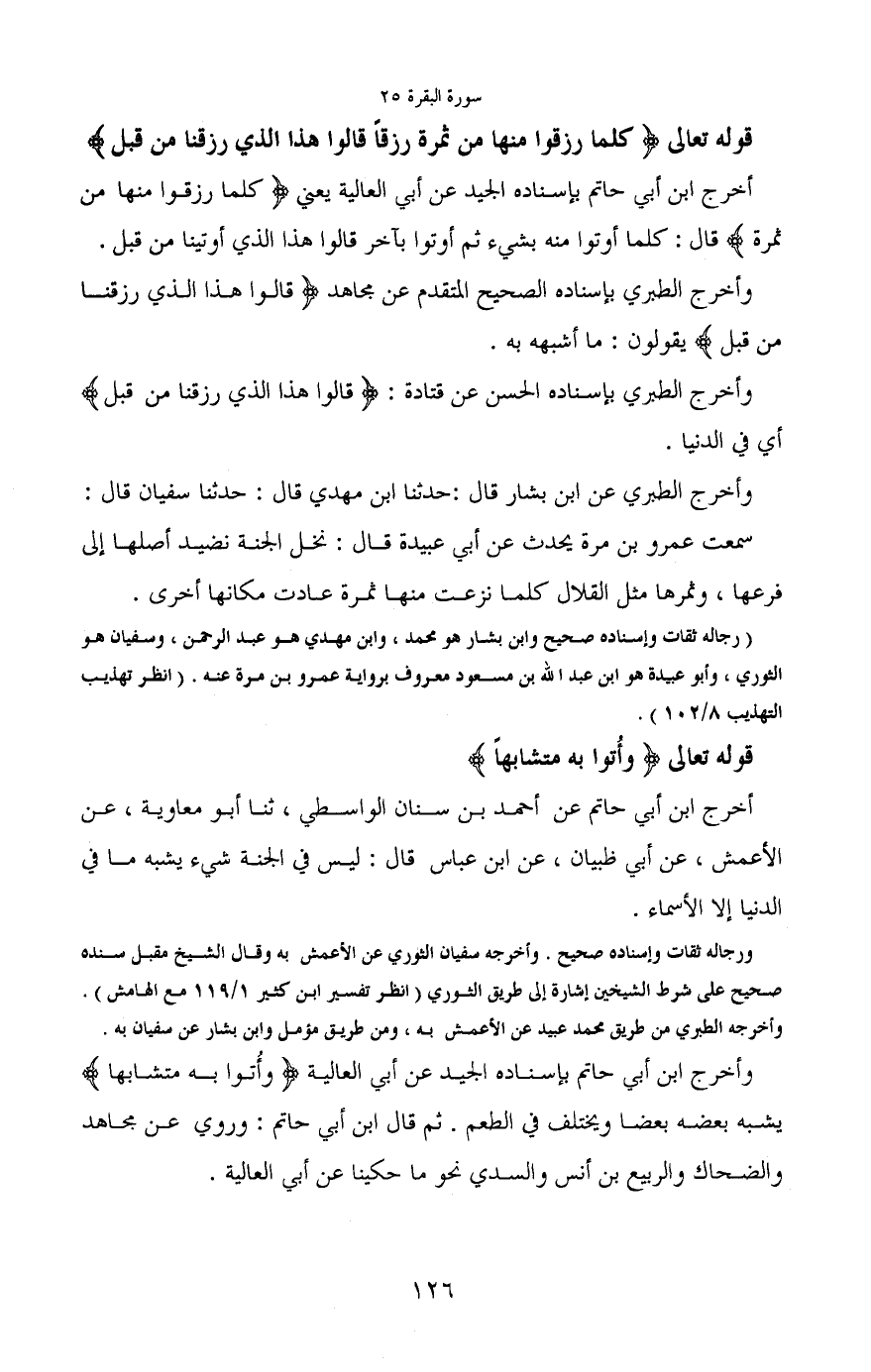 وأخرج ابن أبي حاتم بإسناده الجيد عن أبي العالية (وأتوا به متشابها) يشبه بعضه بعضا ويختلف في الطعم. ثم قال ابن أبي حاتم: وروي عن مجاهد والضحاك والربيع بن أنس والسدي نحو ما حكينا عن أبي العالية.