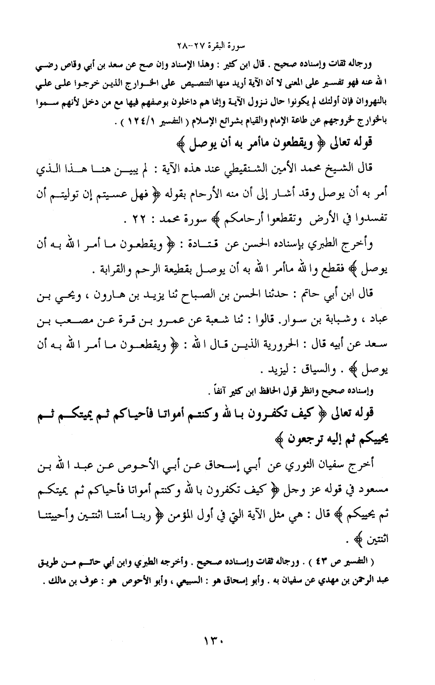 وأخرج الطبري بإسناده الحسن عن قتادة: (ويقطعون ما أمر الله به أن يوصل) فقطع والله ما أمر الله به أن يوصل بقطيعة الرحم والقرابة.