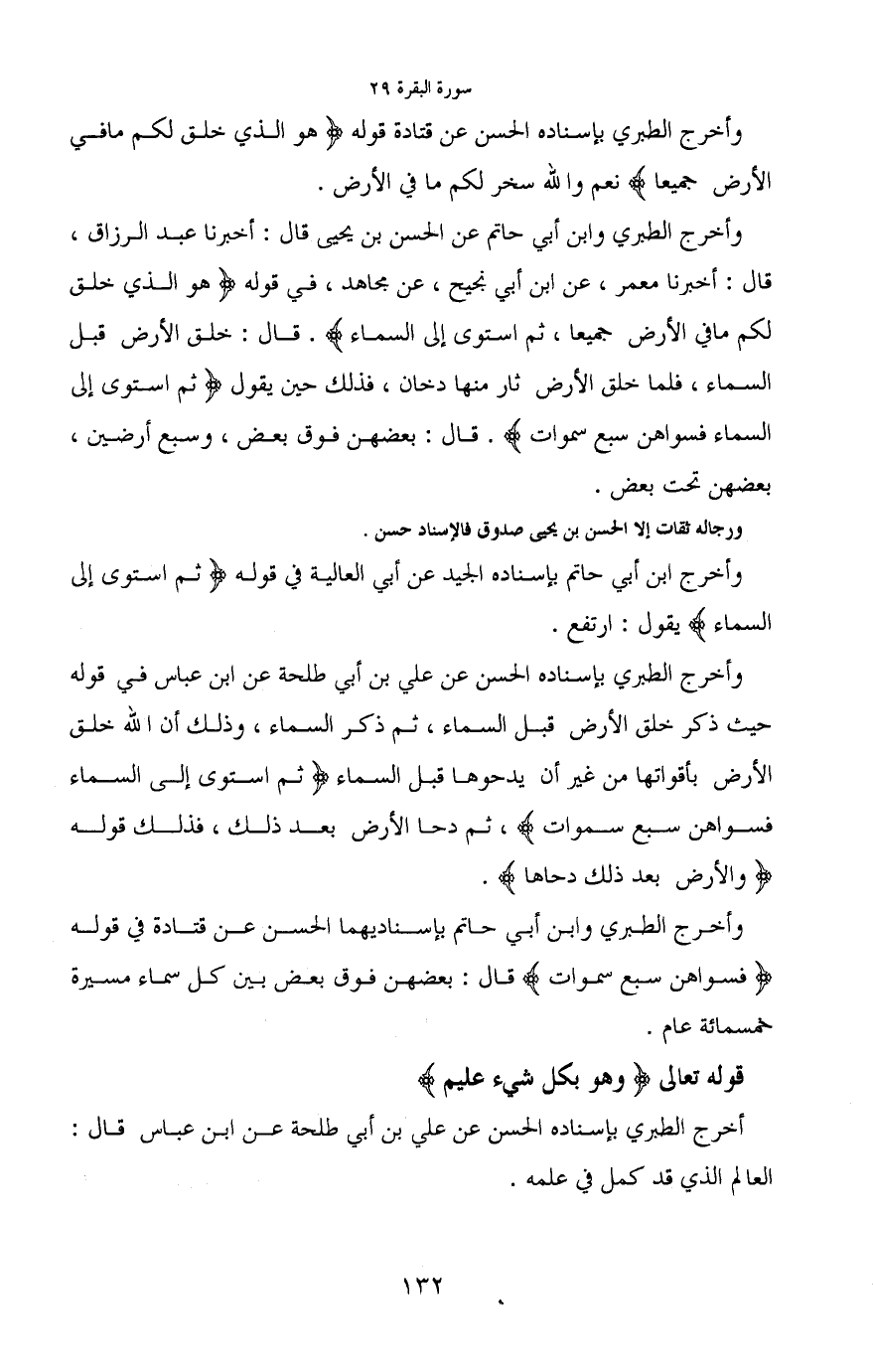 وأخرج الطبري وابن أبي حاتم بإسناديهما الحسن عن قتادة في قوله (فسواهن سبع سموات) قال: بعضهن فوق بعض بين كل سماء مسيرة خمسمائة عام.