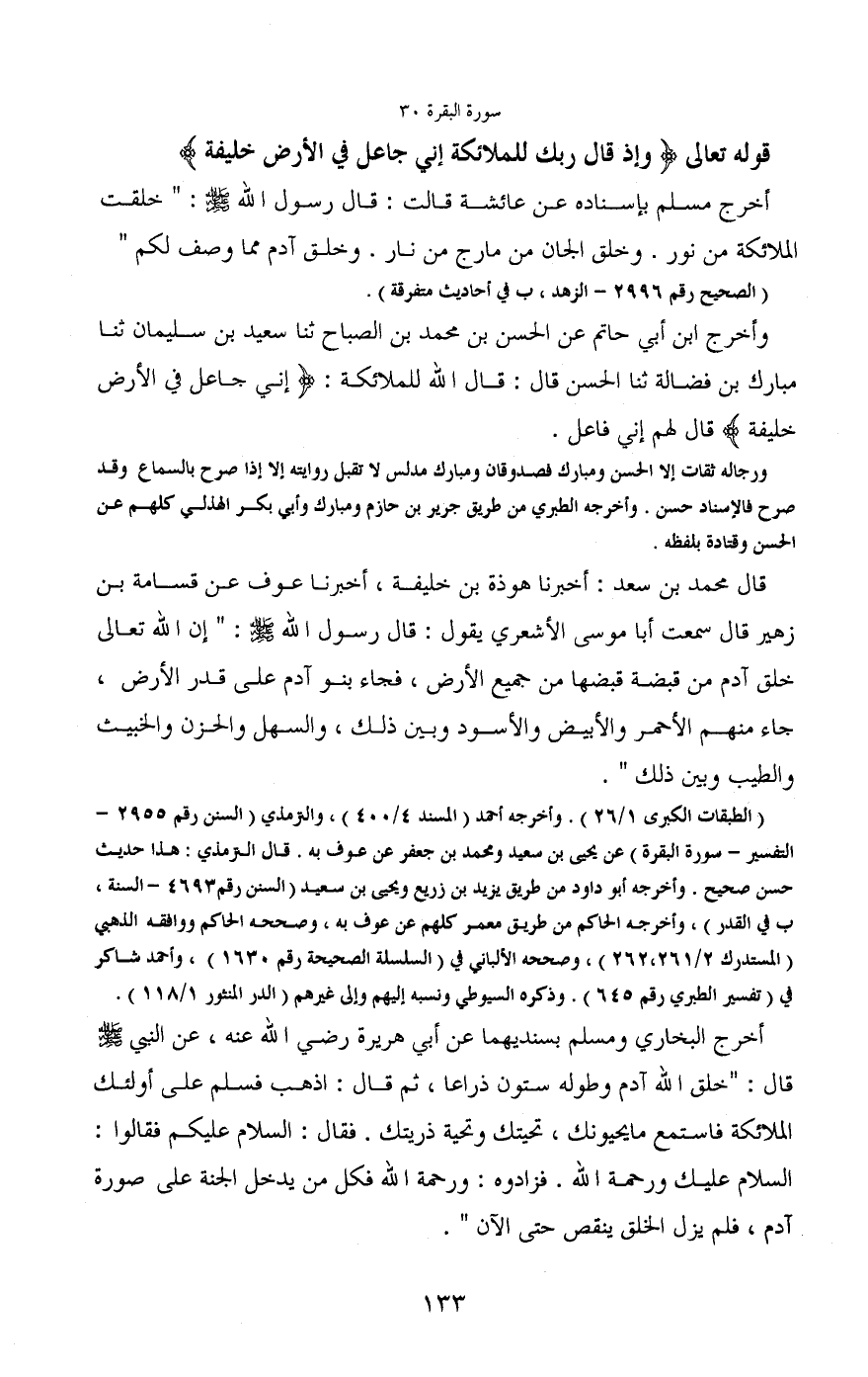 ((الطبقات الكبرى 1/26) . وأخرجه أحمد (المسند 4/400) ، والترمذي (السنن رقم 2955 - التفسير - سورة البقرة) عن يحيى بن سعيد ومحمد بن جعفر عن عوف به. قال الترمذي: هذا حديث حسن صحيح. وأخرجه أبو داود من طريق يزيد بن زريع ويحيى بن سعيد (السنن رقم 4693 - السنة، ب في القدر) ، وأخرجه الحاكم من طريق معمر كلهم عن عوف به، وصححه الحاكم ووافقه الذهبي (المستدرك 2/261، 262) ، وصححه الألباني في (السلسلة الصحيحة رقم 1630) ، وأحمد شاكر في (تفسير الطبري رقم 645) . وذكره السيوطي ونسبه إليهم وإلى غيرهم (الدر المنثور 1/118)) .