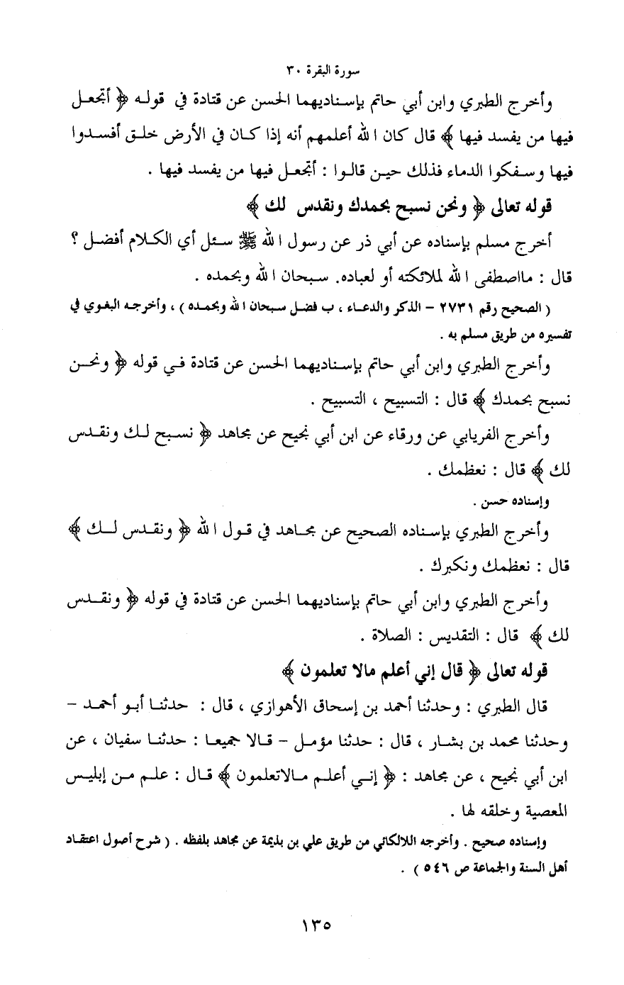 وأخرج الطبري وابن أبي حاتم بإسناديهما الحسن عن قتادة في قوله (ونقدس لك) قال: التقديس: الصلاة.