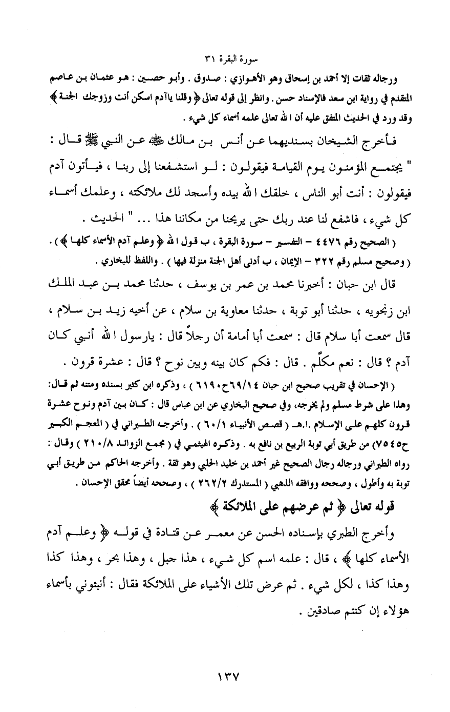 (ورجاله ثقات إلا أحمد بن إسحاق وهو الأهوازي: صدوق. وأبو حصين: هو عثمان بن عاصم المتقدم في رواية ابن سعد فالإسناد حسن. وانظر إلى قوله تعالى (وقلنا يا آدم اسكن أنت وزوجك الجنة) وقد ورد في الحديث المتفق عليه أن الله تعالى علمه أسماء كل شيء) .