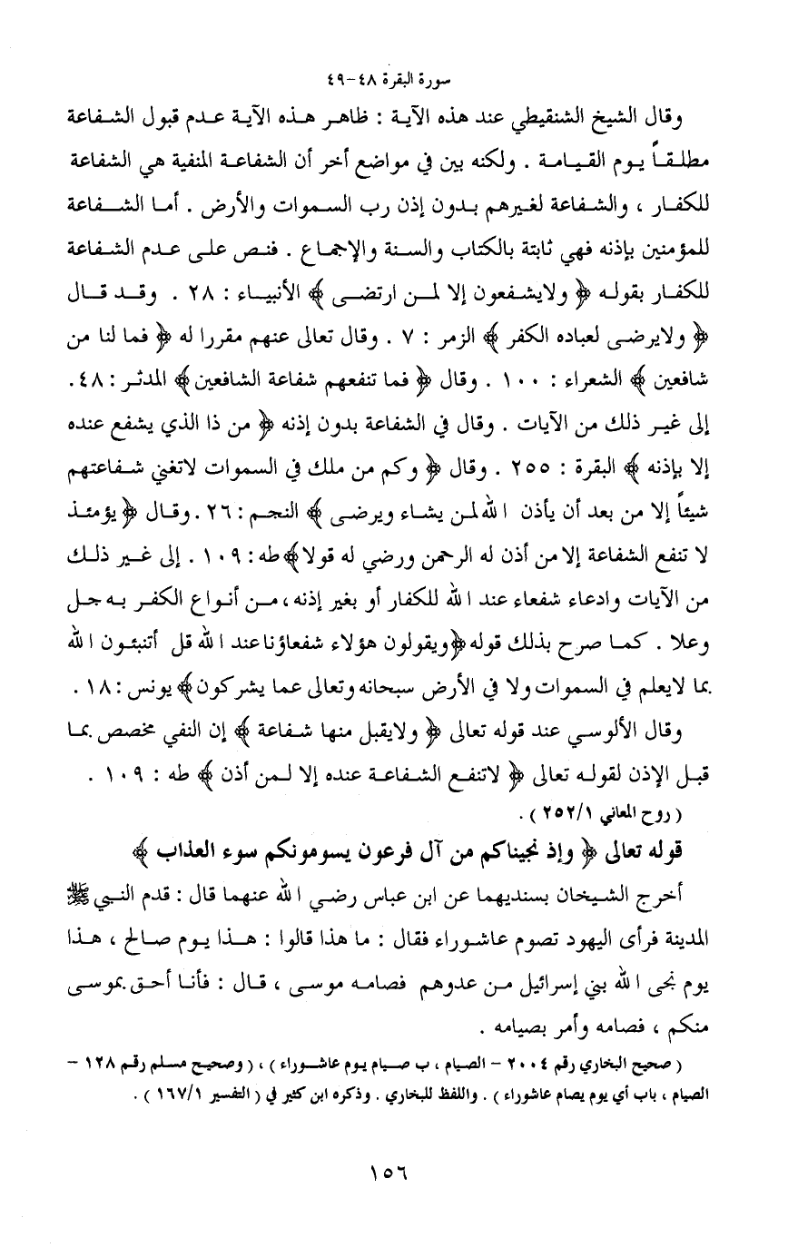 وقال الشيخ الشنقيطي عند هذه الآية: ظاهر هذه الآية عدم قبول الشفاعة مطلقاً يوم القيامة. ولكنه بين في مواضع أخر أن الشفاعة المنفية هي الشفاعة للكفار، والشفاعة لغيرهم بدون إذن رب السموات والأرض. أما الشفاعة للمؤمنين بإذنه فهي ثابتة بالكتاب والسنة والإجماع. فنص على عدم الشفاعة للكفار بقوله (ولا يشفعون إلا لمن ارتضى) الأنبياء: 28. وقد قال (ولا يرضى لعباده الكفر) الزمر: 7. وقال تعالى عنهم مقررا له (فما لنا من شافعين) الشعراء: 100. وقال (فما تنفعهم شفاعة الشافعين) المدثر: 48.