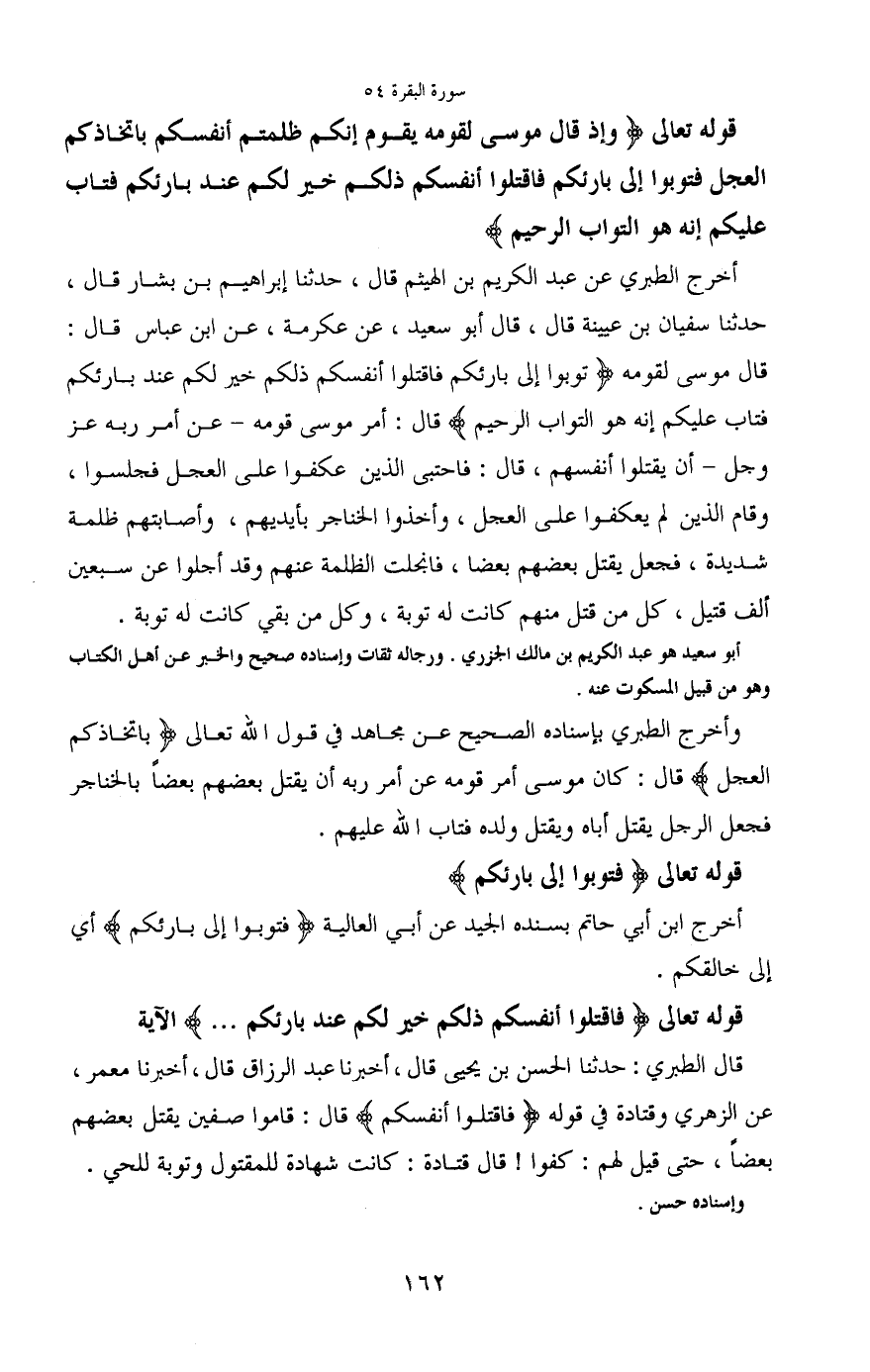 وأخرج الطبري بإسناده الصحيح عن مجاهد في قول الله تعالى (باتخاذكم العجل) قال: كان موسى أمر قومه عن أمر ربه أن يقتل بعضهم بعضاً بالخناجر فجعل الرجل يقتل أباه ويقتل ولده فتاب الله عليهم.