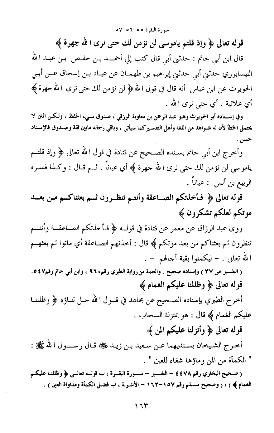 وأخرج ابن أبي حاتم بسنده الصحيح عن قتادة في قول الله تعالى (وإذ قلتم يا موسى لن نؤمن لك حتى نرى الله جهرة) أي عيانا. ثم قال: وكذا فسره الربيع بن أنس: عيانا.