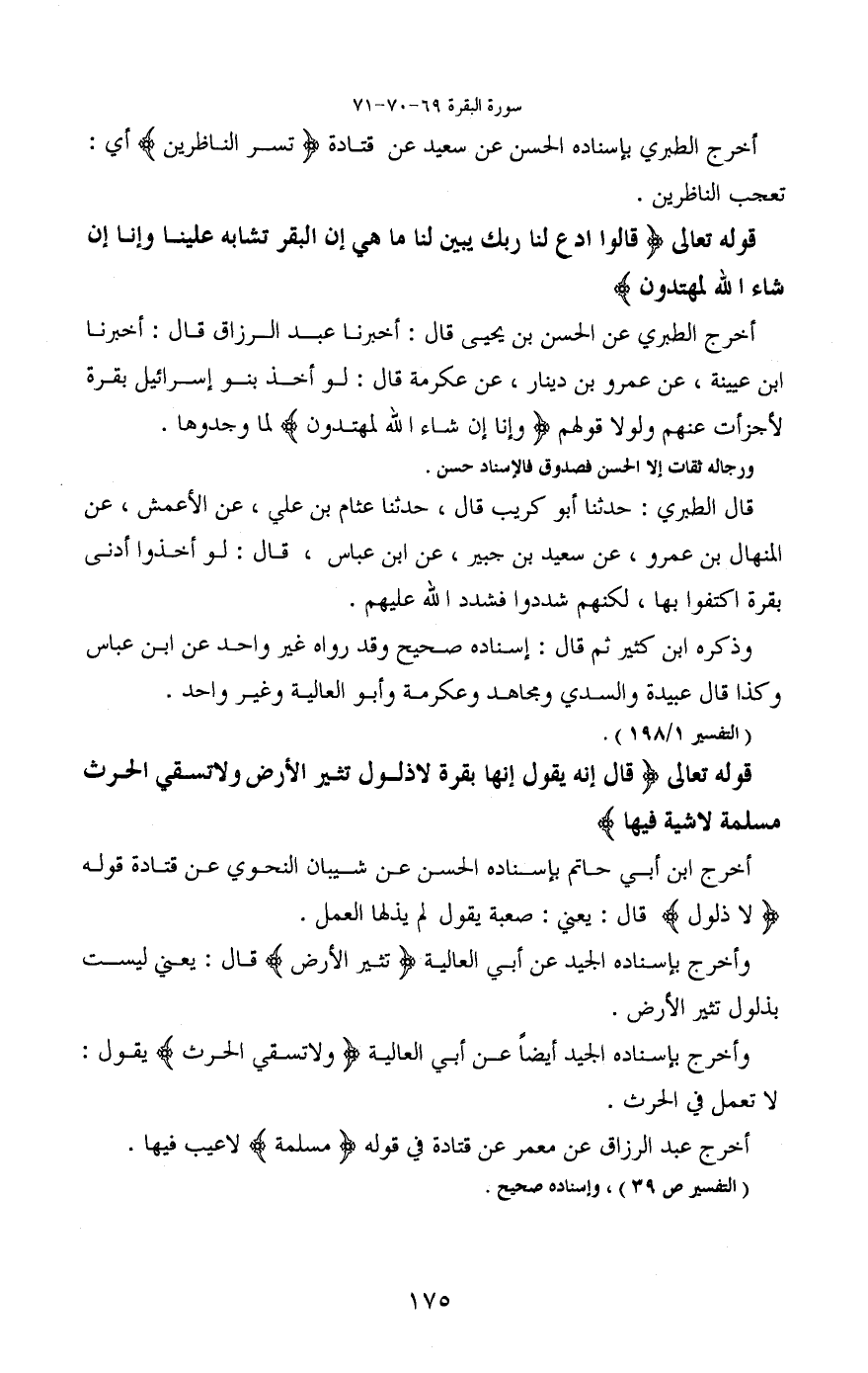 أخرج الطبري عن الحسن بن يحيى قال: أخبرنا عبد الرزاق قال: أخبرنا ابن عيينة، عن عمرو بن دينار، عن عكرمة قال: لو أخذ بنو إسرائيل بقرة لأجزأت عنهم ولولا قولهم (وإنا إن شاء الله لمهتدون) لما وجدوها.