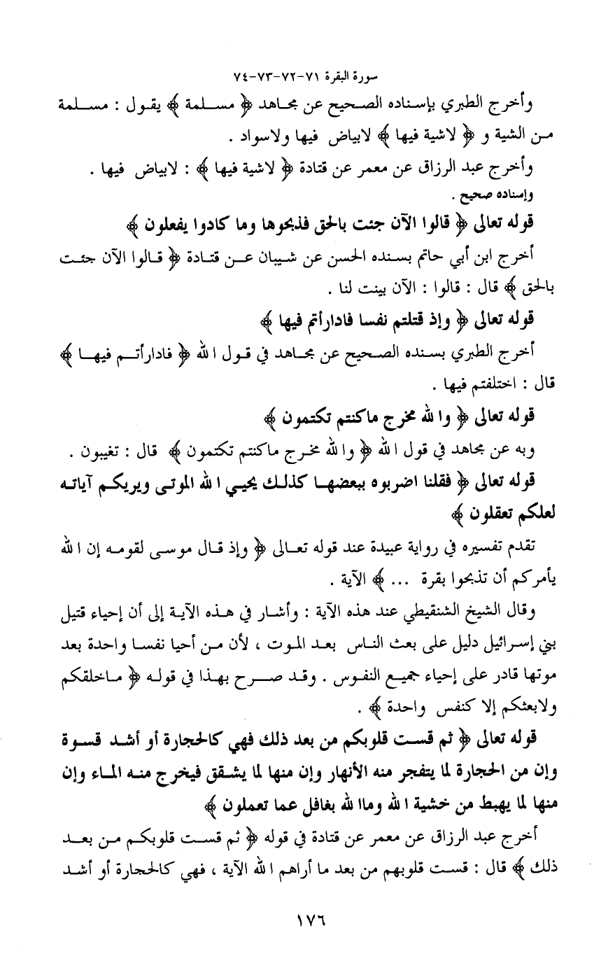 وأخرج الطبري بإسناده الصحيح عن مجاهد (مسلمة) يقول: مسلمة من الشية و (لا شية فيها) لا بياض فيها ولا سواد.