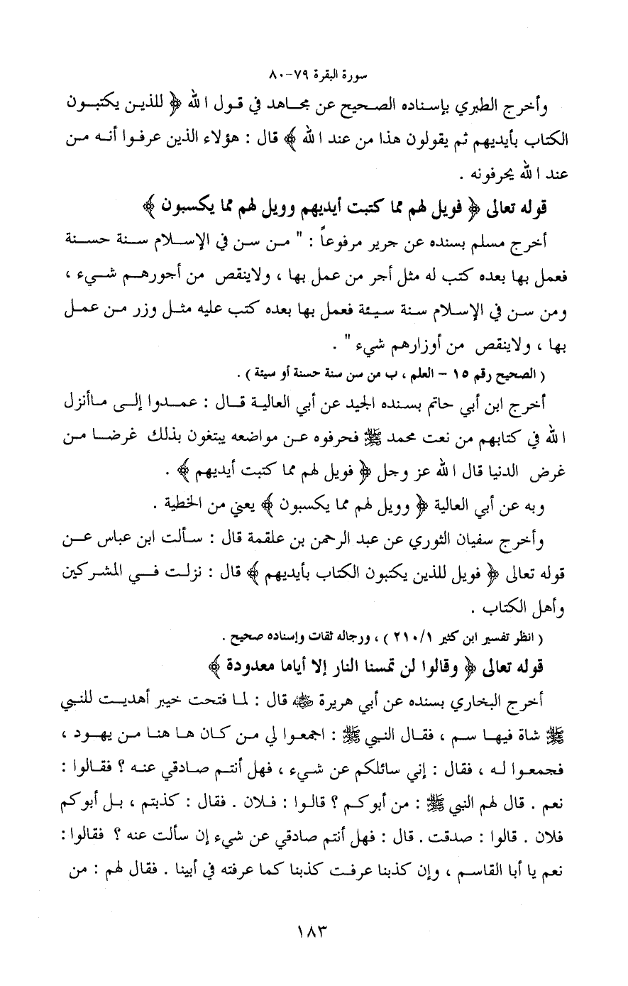 وأخرج سفيان الثوري عن عبد الرحمن بن علقمة قال: سألت ابن عباس عن قوله تعالى (فويل للذين يكتبون الكتاب بأيديهم) قال: نزلت في المشركين وأهل الكتاب.