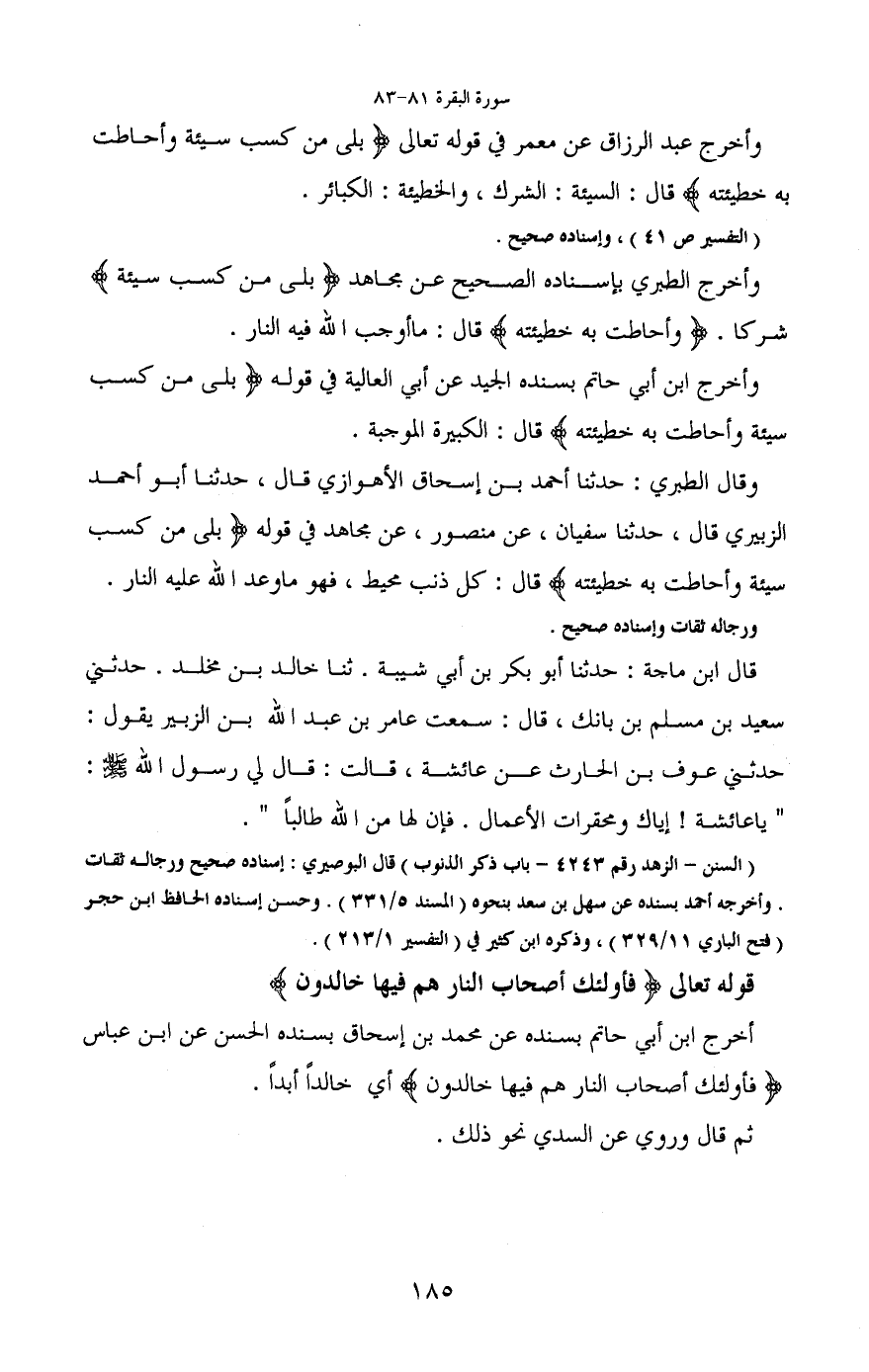 وقال الطبري: حدثنا أحمد بن إسحاق الأهوازي قال، حدثنا أبو أحمد الزبيري قال، حدثنا سفيان، عن منصور، عن مجاهد في قوله (بلى من كسب سيئة وأحاطت به خطيئته) قال: كل ذنب محيط، فهو ما وعد الله عليه النار.