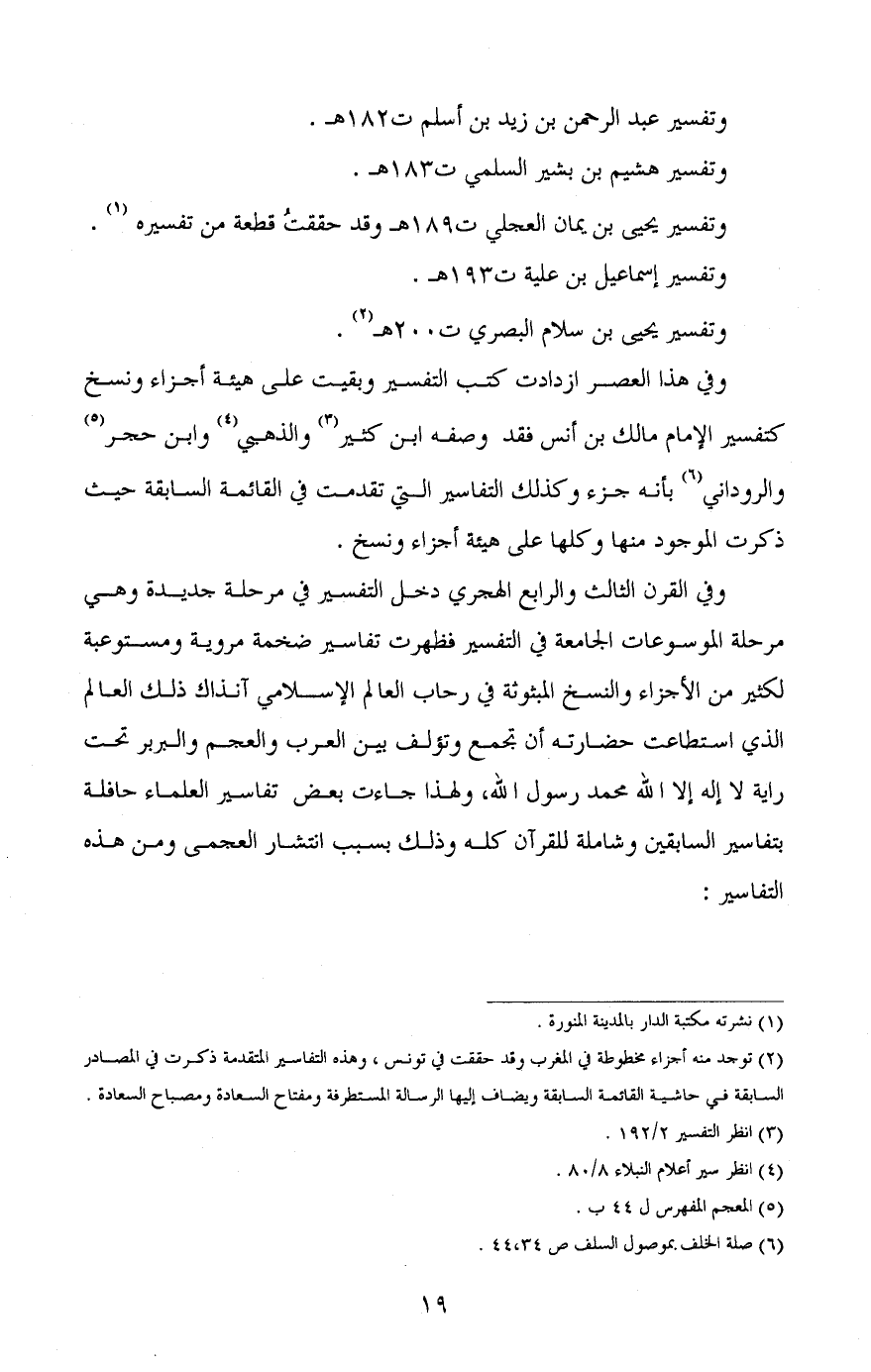 وفي هذا العصر ازدادت كتب التفسير وبقيت على هيئة أجزاء ونسخ كتفسير الإمام مالك بن أنس فقد وصفه ابن كثير (¬3) والذهبي (¬4) وابن حجر (¬5) والروداني (¬6) بأنه جزء وكذلك التفاسير التي تقدمت في القائمة السابقة حيث ذكرت الموجودة منها وكلها على هيئة أجزاء ونسخ.