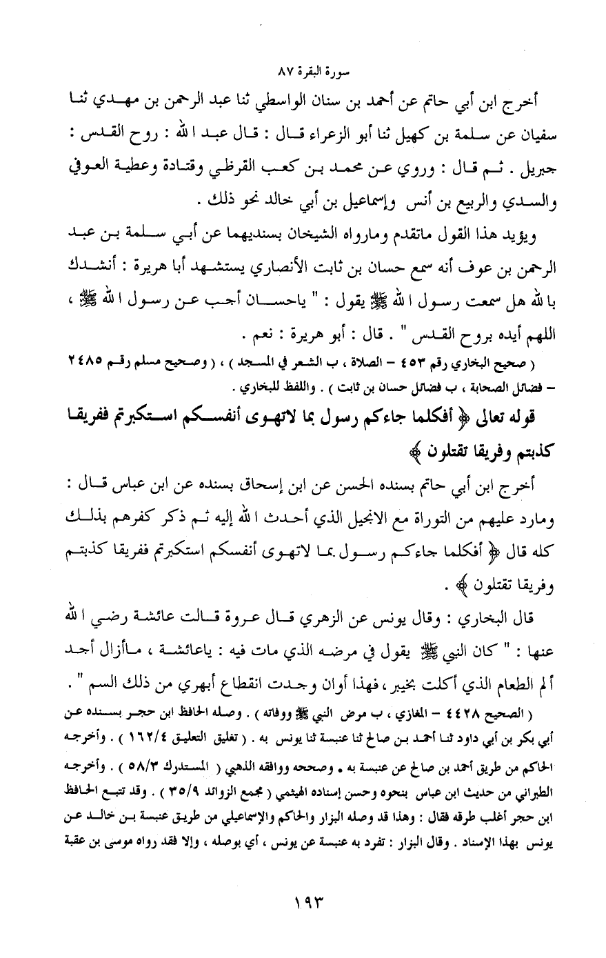 ويؤيد هذا القول ما تقدم وما رواه الشيخان بسنديهما عن أبي سلمة بن عبد الرحمن بن عوف أنه سمع حسان بن ثابت الأنصاري يستشهد أبا هريرة: أنشدك بالله هل سمعت رسول الله - صلى الله عليه وسلم - يقول: "يا حسان أجب عن رسول الله - صلى الله عليه وسلم -، اللهم أيده بروح القدس". قال: أبو هريرة: نعم.
