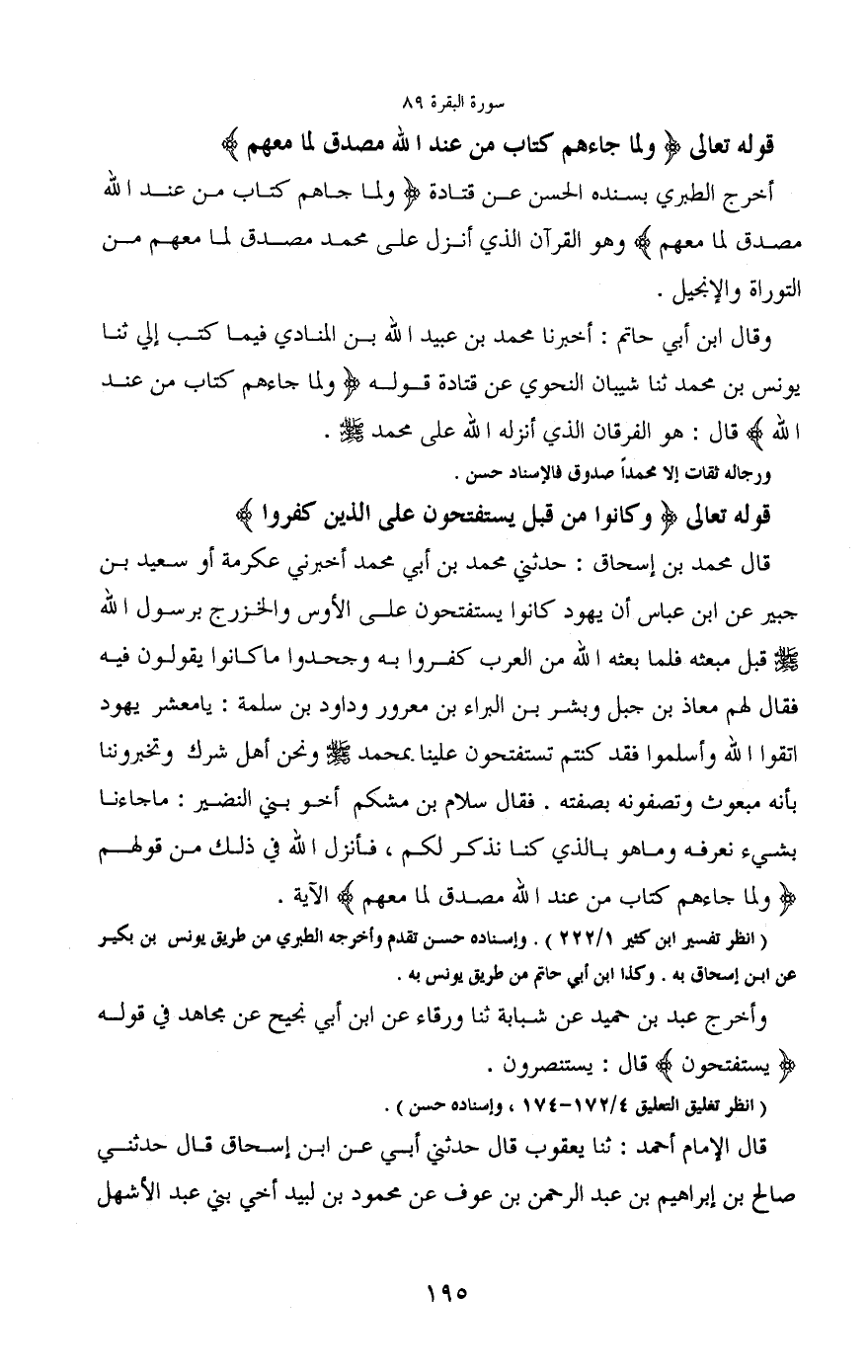 (انظر تفسير ابن كثير 1/222) . وإسناده حسن تقدم وأخرجه الطبري من طريق يونس بن بكير عن ابن إسحاق. وكذا ابن أبي حاتم من طريق يونس به.