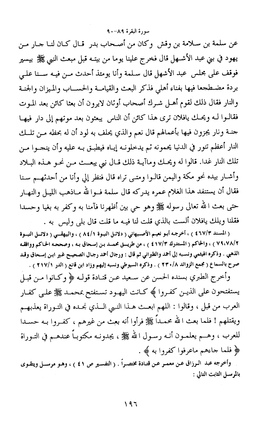 وأخرج الطبري بسنده الحسن عن سعيد عن قتادة قوله (وكانوا من قبل يستفتحون على الذين كفروا كانت اليهود تستفتح بمحمد - صَلَّى اللَّهُ عَلَيْهِ وَسَلَّمَ - على كفار العرب من قبل، وقالوا: اللهم ابعث هذا النبي الذي نجده في التوراة يعذبهم ويقتلهم! فلما بعث الله محمداً - صَلَّى اللَّهُ عَلَيْهِ وَسَلَّمَ - فرأوا أنه بعث من غيرهم، كفروا به حسدا للعرب، وهم يعلمون أنه رسول الله - صَلَّى اللَّهُ عَلَيْهِ وَسَلَّمَ -، يجدونه مكتوباً عندهم في التوراة (فلما جاءهم ما عرفوا كفروا به) .