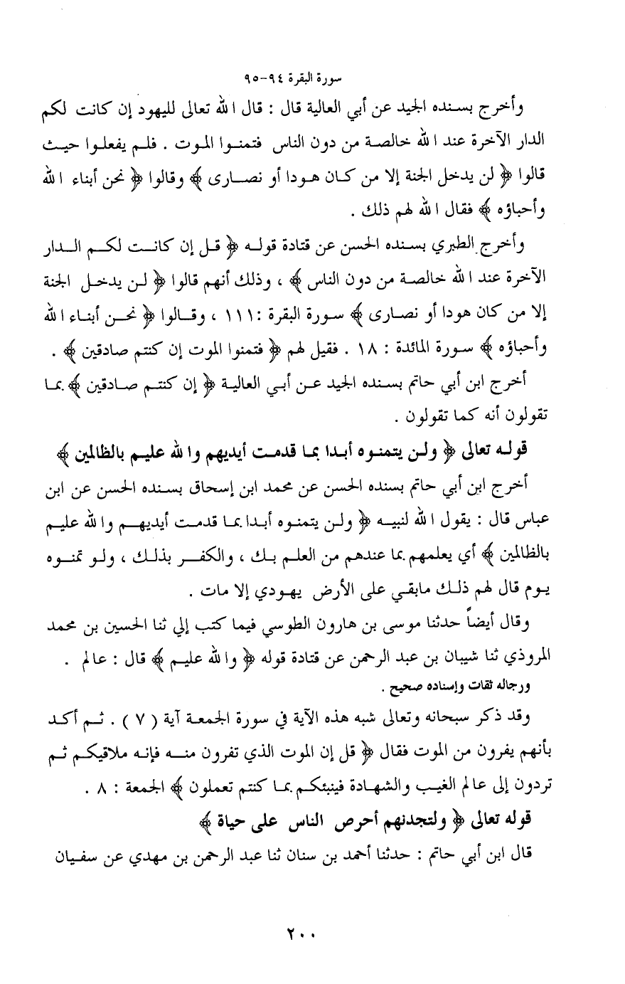 وأخرج بسنده الجيد عن أبي العالية قال: قال الله تعالى لليهود إن كانت لكم الدار الآخرة عند الله خالصة من دون الناس فتمنوا الموت. فلم يفعلوا حيث قالوا (لن يدخل الجنة إلا من كان هودا أو نصارى) وقالوا (نحن أبناء الله وأحباؤه فقال الله لهم ذلك.