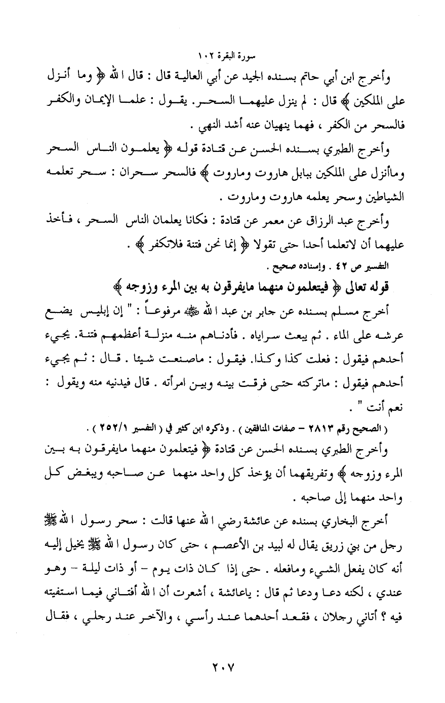 وأخرج الطبري بسنده الحسن عن قتادة قوله (يعلمون الناس السحر وما أنزل على الملكين ببابل هاروت وماروت) فالسحر سحران: سحر تعلمه الشياطين وسحر يعلمه هاروت وماروت.