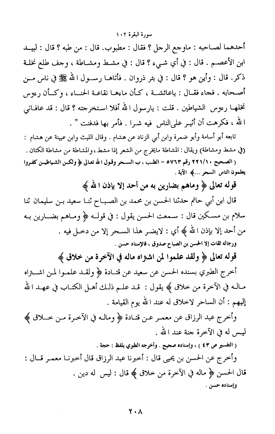 أخرج الطبري بسنده الحسن عن سعيد عن قتادة (ولقد علموا لمن اشتراه ماله في الآخرة من خلاق) بقول: قد علم ذلك أهل الكتاب في عهد الله إليهم: أن الساحر لاخلاق له عند الله يوم القيامة.