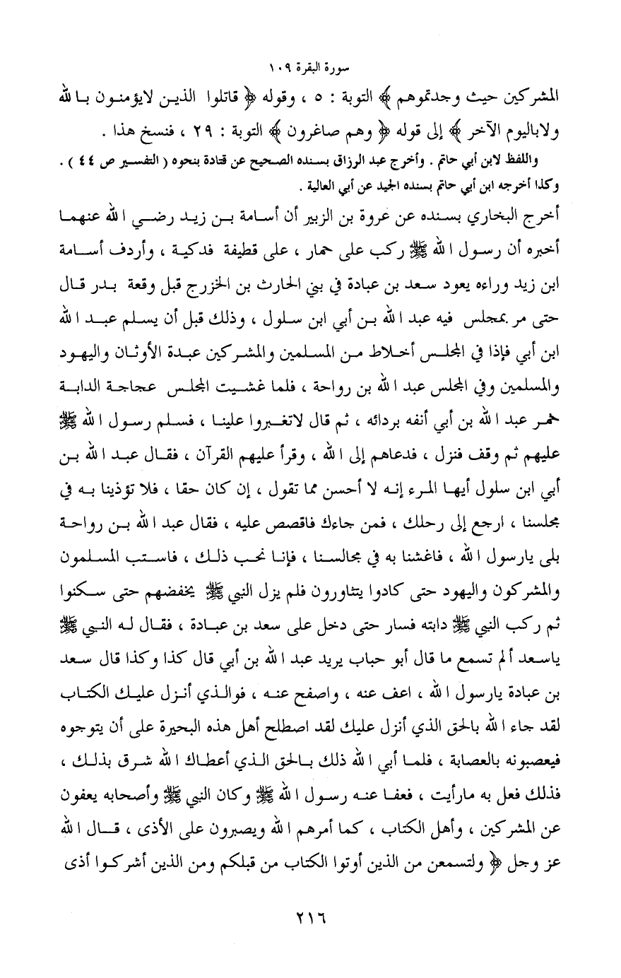 أخرج البخاري بسنده عن عروة بن الزبير أن أسامة بن زيد رضي الله عنهما أخبره أن رسول الله - صَلَّى اللَّهُ عَلَيْهِ وَسَلَّمَ - ركب على حمار، على قطيفة فدكية، وأردف أسامة ابن زيد وراءه يعود سعد بن عبادة في بني الحارث بن الخزرج قبل وقعة بدر قال حتى مر بمجلس فيه عبد الله بن أبي ابن سلول، وذلك قبل أن يسلم عبد الله ابن أبي فإذا في المجلس أخلاط من المسلمين والمشركين عبدة الأوثان واليهود والمسلمين وفي المجلس عبد الله بن رواحة، فلما غشيت المجلس عجاجة الدابة خمر عبد الله بن أبي أنفه بردائه، ثم قال لاتغبروا علينا، فسلم رسول الله - صَلَّى اللَّهُ عَلَيْهِ وَسَلَّمَ - عليهم ثم وقف فنزل، فدعاهم إلى الله، وقرأ عليهم القرآن، فقال عبد الله بن أبي ابن سلول أيها المرء إنه لا أحسن مما تقول، إن كان حقاً، فلا تؤذينا به في مجلسنا، ارجع إلى رحلك، فمن جاءك فاقصص عليه، فقال عبد الله بن رواحة بلى يا رسول الله، فاغشنا به في مجالسنا، فإنا نحب ذلك، فاستب المسلمون والمشركون واليهود حتى كادوا يتثاورون فلم يزل النبي - صَلَّى اللَّهُ عَلَيْهِ وَسَلَّمَ - يخفضهم حتى سكنوا ثم ركب النبي - صَلَّى اللَّهُ عَلَيْهِ وَسَلَّمَ - دابته فسار حتى دخل على سعد بن عبادة، فقال له النبي - صَلَّى اللَّهُ عَلَيْهِ وَسَلَّمَ - يا سعد ألم تسمع ما قال أبو حباب يريد عبد الله بن أبي قال كذا وكذا قال سعد بن عبادة يا رسول الله، اعف عنه، واصفح عنه، فوالذي أنزل عليك الكتاب لقد جاء الله بالحق الذي أنزل عليك لقد اصطلح أهل هذه البحيرة على أن يتوجوه فيعصبونه بالعصابة فلما أبي الله ذلك بالحق الذي أعطاك الله شرق بذلك، فذلك فعل به ما رأيت، فعفا عنه رسول الله - صَلَّى اللَّهُ عَلَيْهِ وَسَلَّمَ - وكان النبي - صَلَّى اللَّهُ عَلَيْهِ وَسَلَّمَ - وأصحابه يعفون عن المشركين، وأهل الكتاب، كما أمرهم الله ويصبرون على الأذى، قال الله عز وجل (ولتسمعن من الذين أوتوا الكتاب من قبلكم ومن الذين أشركوا أذى
