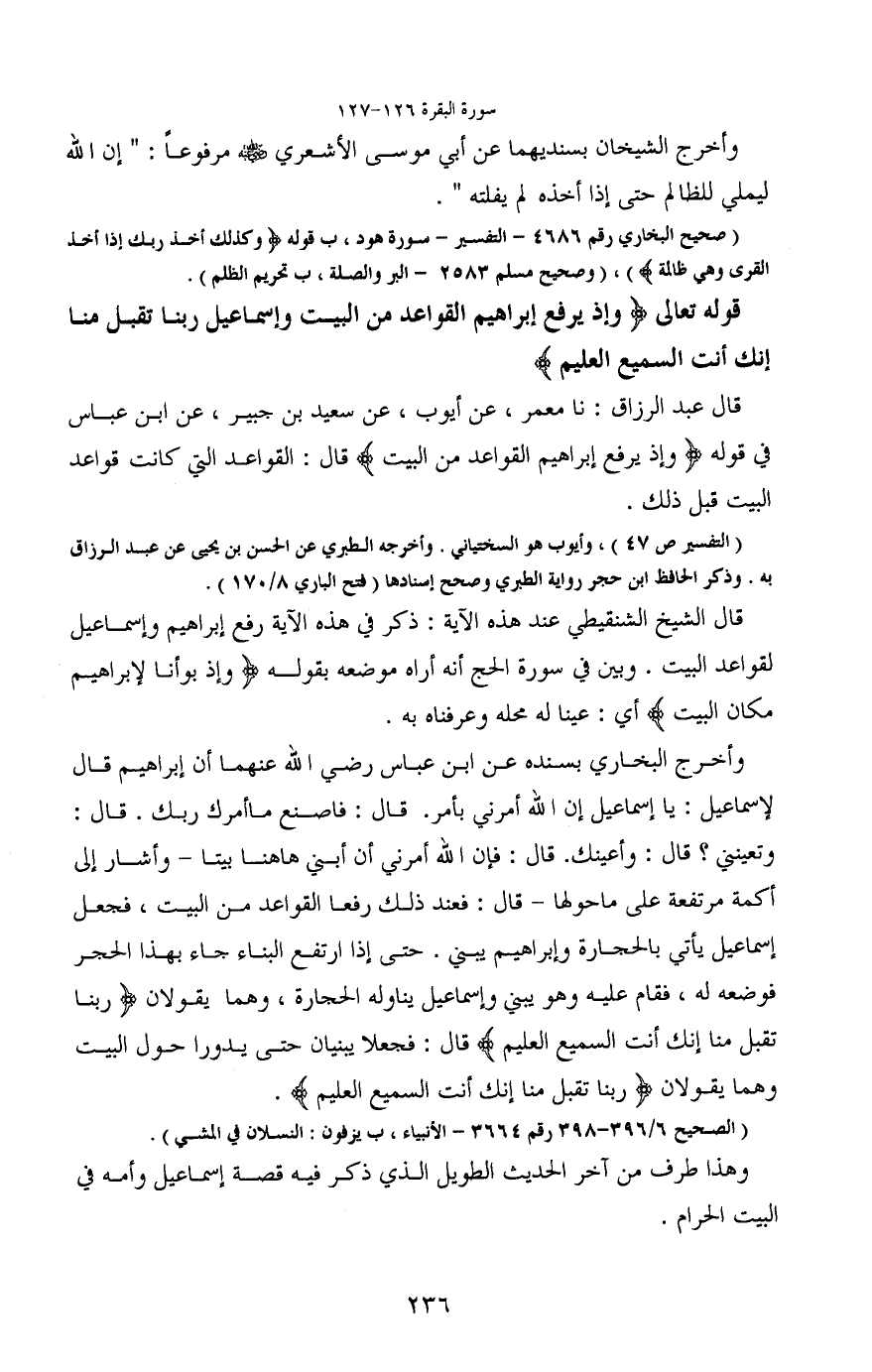 قال الشيخ الشنقيطي عند هذه الآية: ذكر في هذه الآية رفع إبراهيم وإسماعيل لقواعد البيت. وبين في سورة الحج أنه أراه موضعه بقوله (وإذ بوأنا لإبراهيم مكان البيت) أي: عينا له محله وعرفناه به.