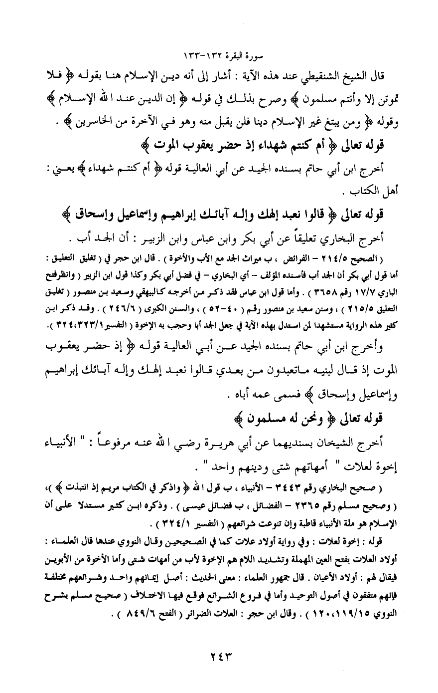 قال الشيخ الشنقيطي عند هذه الآية: أشار إلى أنه دين الإسلام هنا بقوله (فلا تموتن إلا وأنتم مسلمون) وصرح بذلك في قوله (إن الدين عند الله الإسلام) وقوله (ومن يبتغ غير الإسلام دينا فلن يقبل منه وهو في الآخرة من الخاسرين) .