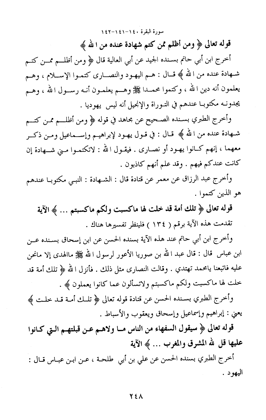 وأخرج ابن أبي حاتم عند هذه الآية بسنده الحسن عن ابن إسحاق بسنده عن ابن عباس قال: قال عبد الله بن صوريا الأعور لرسول الله - صَلَّى اللَّهُ عَلَيْهِ وَسَلَّمَ - ما الهدى إلا ما نحن عليه فاتبعنا يا محمد تهتدي. وقالت النصارى مثل ذلك. فأنزل الله (تلك أمة قد خلت لها ماكسبت ولكم ماكسبتم ولاتسألون عما كانوا يعملون) .