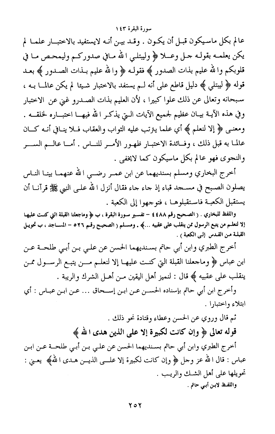 أخرج الطبري وابن أبي حاتم بسنديهما الحسن عن علي بن أبي طلحة عن ابن عباس: قال الله عز وجل (وإن كانت لكبيرة إلا على الذين هدى الله) يعني: تحويلها على أهل الشك والريب.