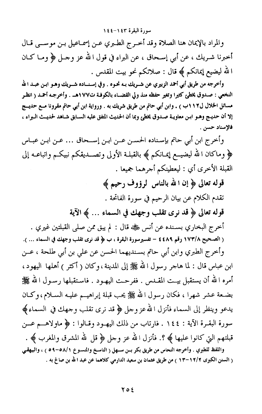 وأخرج ابن أبي حاتم بإسناده الحسن عن ابن إسحاق ... عن ابن عباس (وما كان الله ليضيع إيمانكم بالقبلة الأولى وتصديقكم نبيكم واتباعه إلى القبلة الأخرى أي: ليعطينكم أجرهما جميعا.