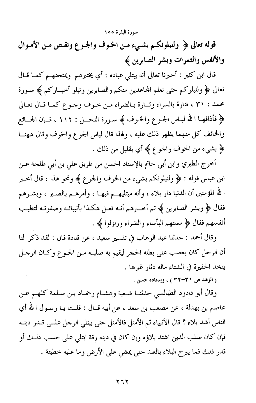أخرج الطبري وابن أبي حاتم بالإسناد الحسن من طريق علي بن أبي طلحة عن ابن عباس قوله: (ولنبلونكم بشيء من الخوف والجوع) ونحو هذا، قال أخبر الله المؤمنين أن الدنيا دار بلاء، وأنه مبتليهم فيها، وأمرهم بالصبر، وبشرهم فقال (وبشر الصابرين) ثم أخبرهم أنه فعل هكذا بأنبيائه وصفوته لتطيب أنفسهم فقال (مستهم البأساء والضراء وزلزلوا) .
