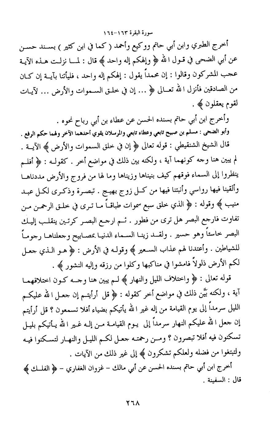 أخرج الطبري وابن أبي حاتم ووكيع وأحمد (كما في ابن كثير) بسند حسن عن أبي الضحى في قول الله (وإلهكم إله واحد) قال: لما نزلت هذه الآية عجب المشركون وقالوا: إن محمداً يقول: إلهكم إله واحد، فليأتنا بآية إن كان من الصادقين فأنزل الله تعالى ( ... إن في خلق السموات والأرض ... لآيات لقوم يعقلون) .