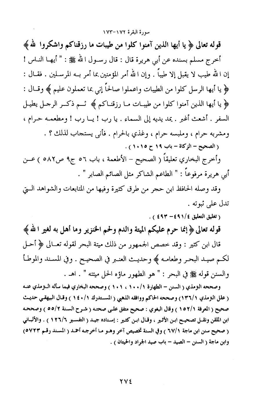 قال ابن كثير: وقد خصص الجمهور من ذلك ميتة البحر لقوله تعالى (أحل لكم صيد البحر وطعامه) وحديث العنبر في الصحيح. وفي المسند والموطأ والسنن قوله - صَلَّى اللَّهُ عَلَيْهِ وَسَلَّمَ - في البحر: "هو الطهور ماؤه الحل ميتته". اهـ.