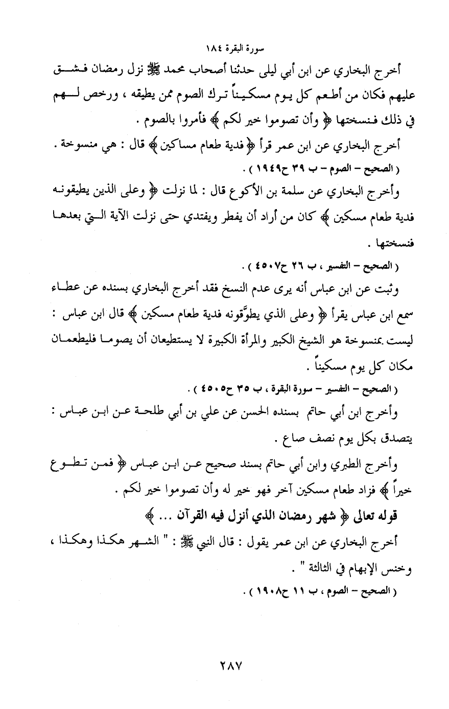وأخرج البخاري عن سلمة بن الأكوع قال: لما نزلت (وعلى الذين يطيقونه فدية طعام مسكين) كان من أراد أن يفطر ويفتدي حتى نزلت الآية التي بعدها فنسختها.