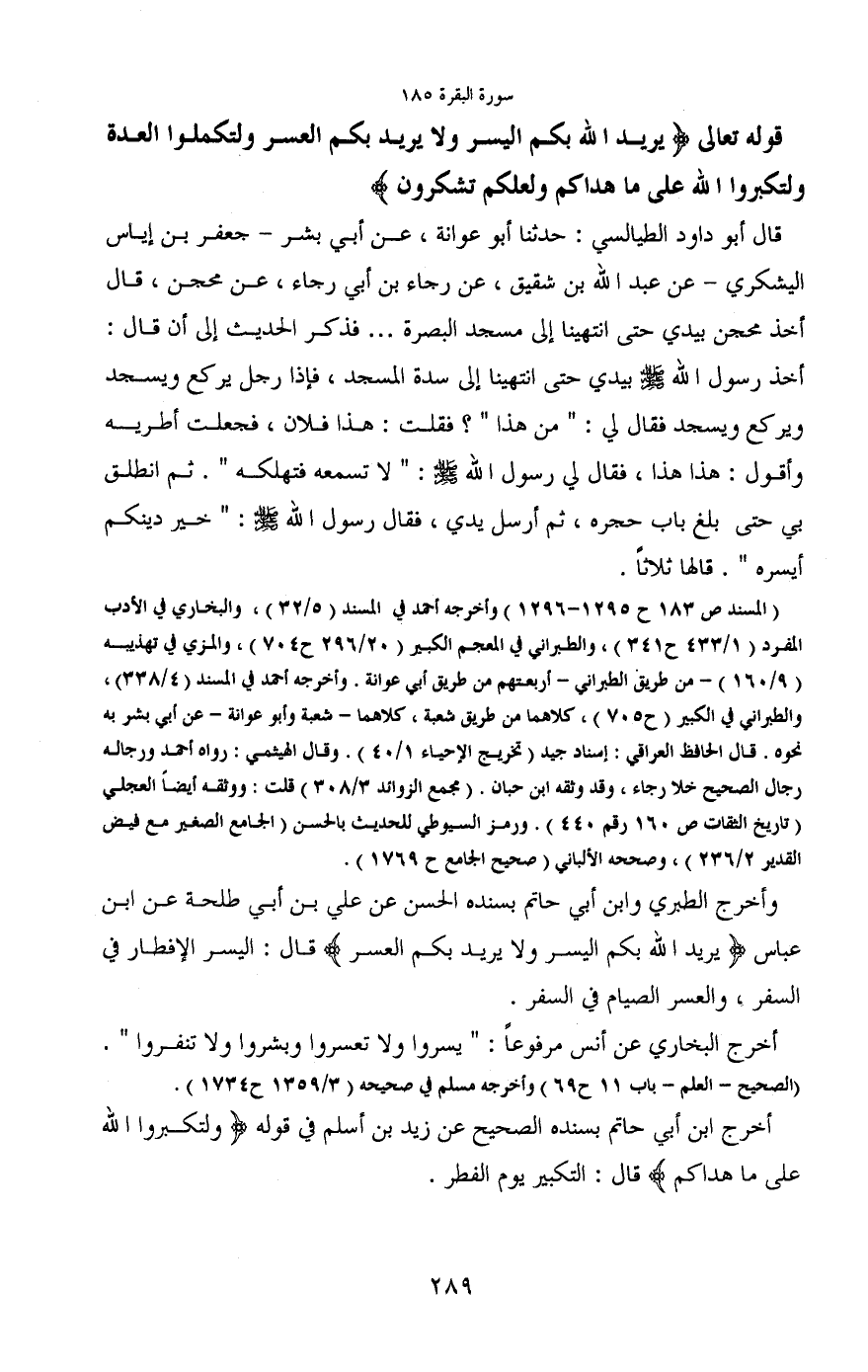 وأخرج الطبري وابن أبي حاتم بسنده الحسن عن علي بن أبي طلحة عن ابن عباس (يريد الله بكم اليسر ولا يريد بكم العسر) قال: اليسر الإفطار في السفر، والعسر الصيام في السفر.