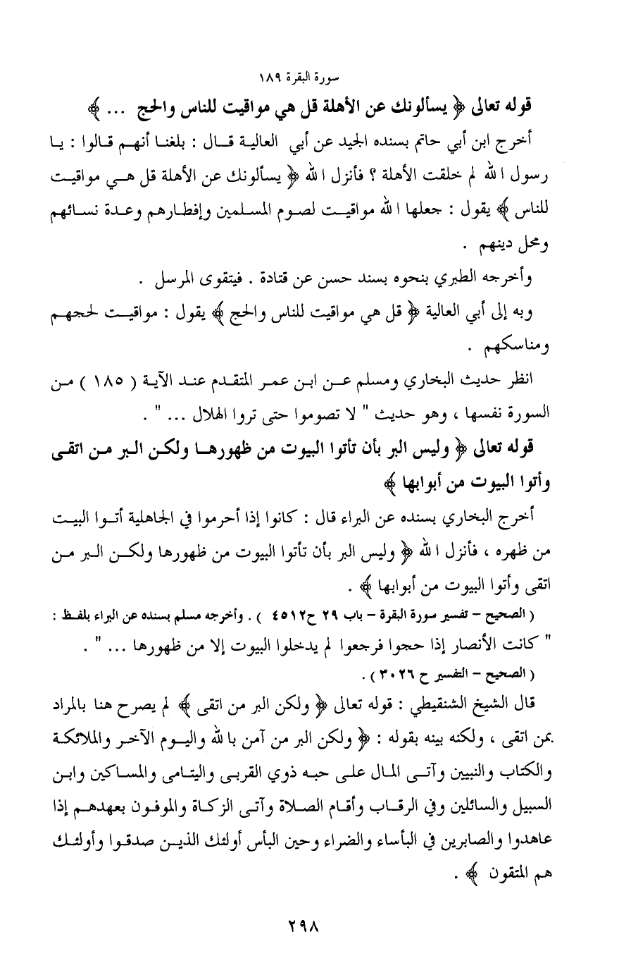قال الشيخ الشنقيطي: قوله تعالى (ولكن البر من اتقى) يصرح هنا بالمراد بمن اتقى، ولكنه بينه بقوله: (ولكن البر من آمن بالله واليوم الآخر والملائكة والكتاب والنبيين وآتى المال على حبه ذوي القربى واليتامى والمساكين وابن السبيل والسائلين وفي الرقاب وأقام الصلاة وآتى الزكاة والموفون بعهدهم إذا عاهدوا والصابرين في البأساء والضراء وحين البأس أولئك الذين صدقوا وأولئك هم المتقون) .