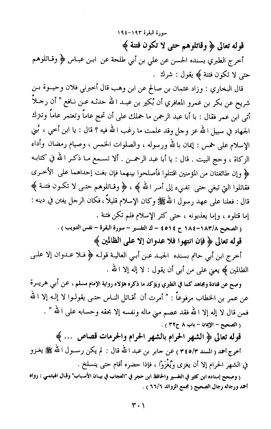 وصح عن قتادة ومجاهد كما في الطبري ويؤكد ما ذكره هؤلاء رواية الإمام مسلم، عن أبي هريرة عن عمر بن الخطاب مرفوعاً: "أمرت أن أقاتل الناس حتى يقولوا لا إله إلا الله فمن قال لا إله إلا الله فقد عصم مني ماله ونفسه إلا بحقه وحسابه على الله".