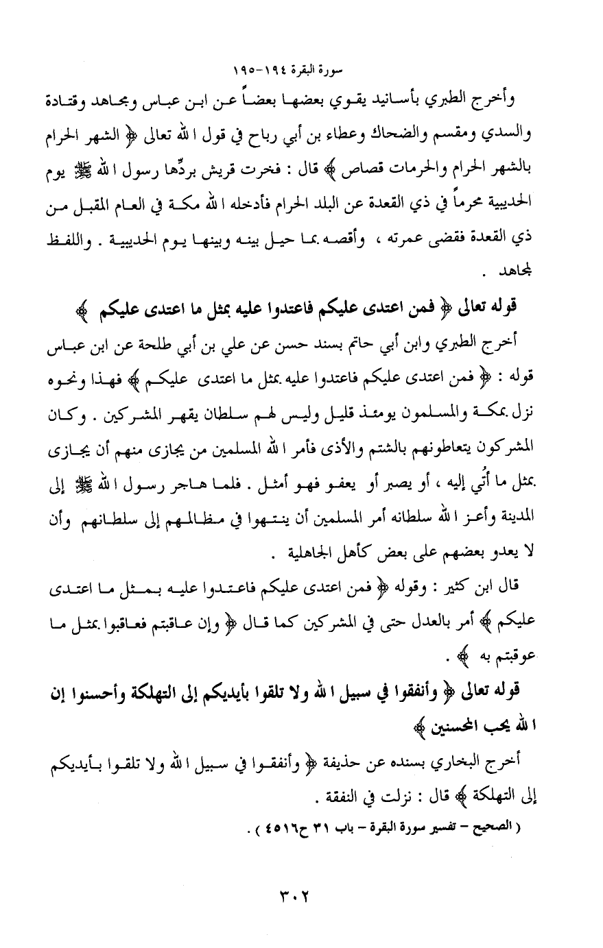 وأخرج الطبري بأسانيد يقوي بعضها بعضاً عن ابن عباس ومجاهد وقتادة والسدي ومقسم والضحاك وعطاء بن أبي رباح في قول الله تعالى (الشهر الحرام بالشهر الحرام والحرمات قصاص) قال: فخرت قريش بردِّها رسول الله - صَلَّى اللَّهُ عَلَيْهِ وَسَلَّمَ - يوم الحديبية محرماً في ذي القعدة عن البلد الحرام فأدخله الله مكة في العام المقبل من ذي القعدة فقضى عمرته، وأقصه بما حيل بينه وبينها يوم الحديبية. واللفظ لمجاهد.