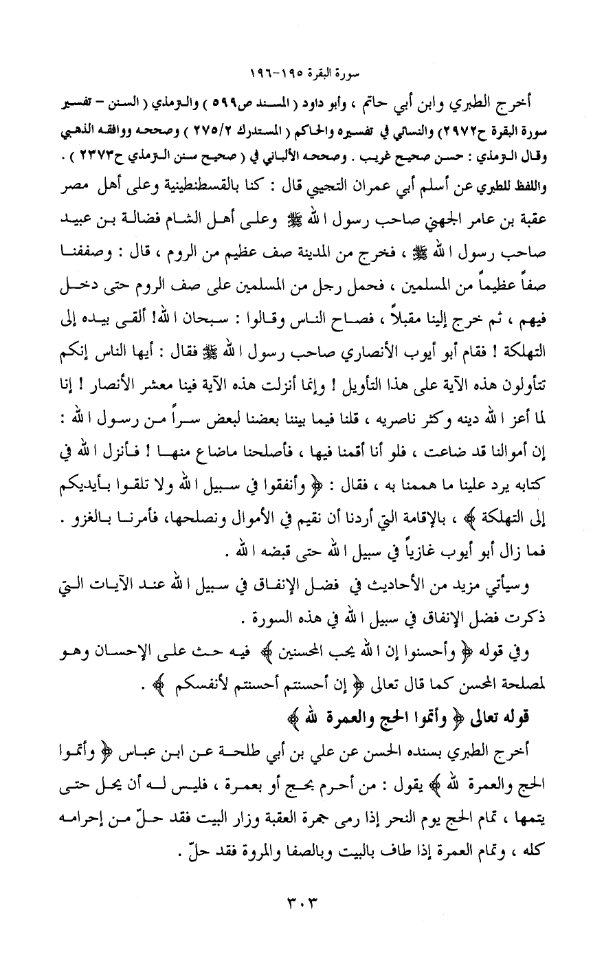 واللفظ للطبري عن أسلم أبي عمران التجيي قال: كنا بالقسطنطينية وعلى أهل مصر عقبة بن عامر الجهني صاحب رسول الله - صَلَّى اللَّهُ عَلَيْهِ وَسَلَّمَ - وعلى أهل الشام فضالة بن عبيد صاحب رسول الله - صَلَّى اللَّهُ عَلَيْهِ وَسَلَّمَ -، فخرج من المدينة صف عظيم من الروم، قال: وصففنا صفاً عظيماً من المسلمين، فحمل رجل من المسلمين على صف الروم حتى دخل فيهم، ثم خرج إلينا مقبلاً، فصاح الناس وقالوا: سبحان الله! ألقى بيده إلى التهلكة! فقام أبو أيوب الأنصاري صاحب رسول الله - صَلَّى اللَّهُ عَلَيْهِ وَسَلَّمَ - فقال: أيها الناس إنكم تتأولون هذه الآية على هذا التأويل! وإنما أنزلت هذه الآية فينا معشر الأنصار! إنا لما أعز الله دينه وكثر ناصريه, قلنا فيما بيننا بعضنا لبعض سراً من رسول الله: إن أموالنا قد ضاعت، فلو أنا أقمنا فيها، فأصلحنا ما ضاع منها! فأنزل الله في كتابه يرد علينا ما هممنا به، فقال: (وأنفقوا في سبيل الله ولا تلقوا بأيديكم إلى التهلكة) ، بالإقامة التي أردنا أن نقيم في الأموال ونصلحها، فأمرنا بالغزو.