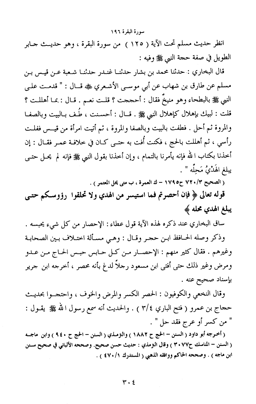 قال البخاري: حدثنا محمد بن بشار حدثنا غندر حدثنا شعبة عن قيس بن مسلم عن طارق بن شهاب عن أبي موسى الأشعري - رضي الله عنه - قال: "قدمت على النبي - صَلَّى اللَّهُ عَلَيْهِ وَسَلَّمَ - بالبطحاء وهو منيخٌ فقال: أحججت؟ قلت نعم. قال: مما أهللت؟ قلت: لبيك بإهلال كإهلال النبي - صَلَّى اللَّهُ عَلَيْهِ وَسَلَّمَ -. قال: أحسنت، طف بالبيت وبالصفا والمروة ثم أحل. فطفت بالبيت وبالصفا والمروة، ثم أتيت امرأة من قيس ففلت رأسي، ثم أهللت بالحج، فكنت أفت به حتى كان في خلافة عمر فقال: إن أخذنا بكتاب الله فإنه يأمرنا بالتمام، وإن أخذنا بقول النبي - صَلَّى اللَّهُ عَلَيْهِ وَسَلَّمَ - فإنه لم يحل حتى يبلغ الهَدْيُ مَحِلَّه".