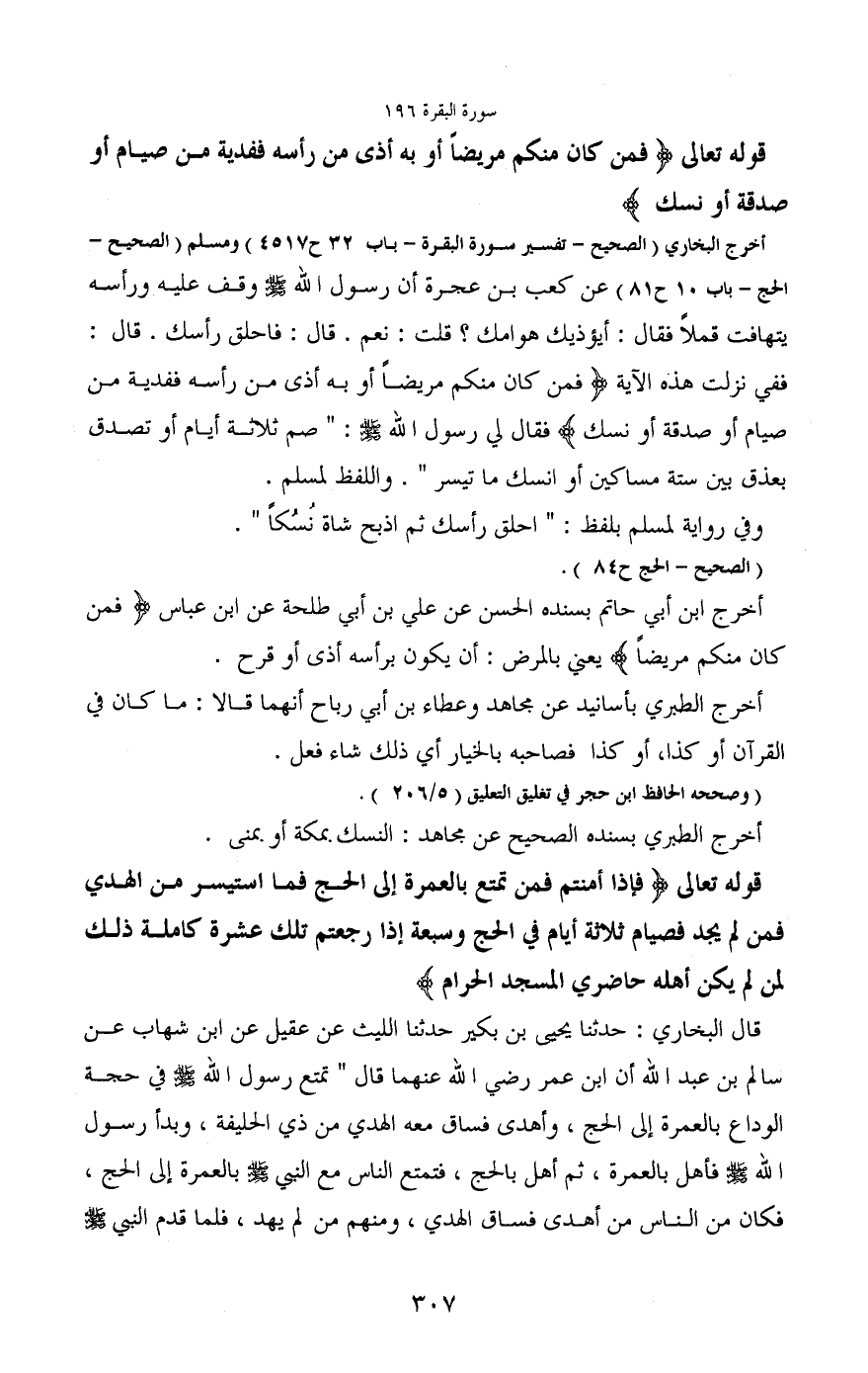 أخرج البخاري (الصحيح- تفسير سورة البقرة- باب 32 ح 4517) ومسلم (الصحيح -الحج- باب 10 ح 81) عن كعب بن عجرة أن رسول الله - صَلَّى اللَّهُ عَلَيْهِ وَسَلَّمَ - وقف عليه ورأسه يتهافت قملاً فقال: أيؤذيك هوامك؟ قلت: نعم. قال: فاحلق رأسك. قال: ففي نزلت هذه الآية (فمن كان منكم مريضاً أو به أذى من رأسه ففدية من صيام أو صدقة أو نسك) فقال لي رسول الله - صَلَّى اللَّهُ عَلَيْهِ وَسَلَّمَ -: "صم ثلاثة أيام أو تصدق بعذق بين ستة مساكين أو انسك ما تيسر". واللفظ لمسلم.