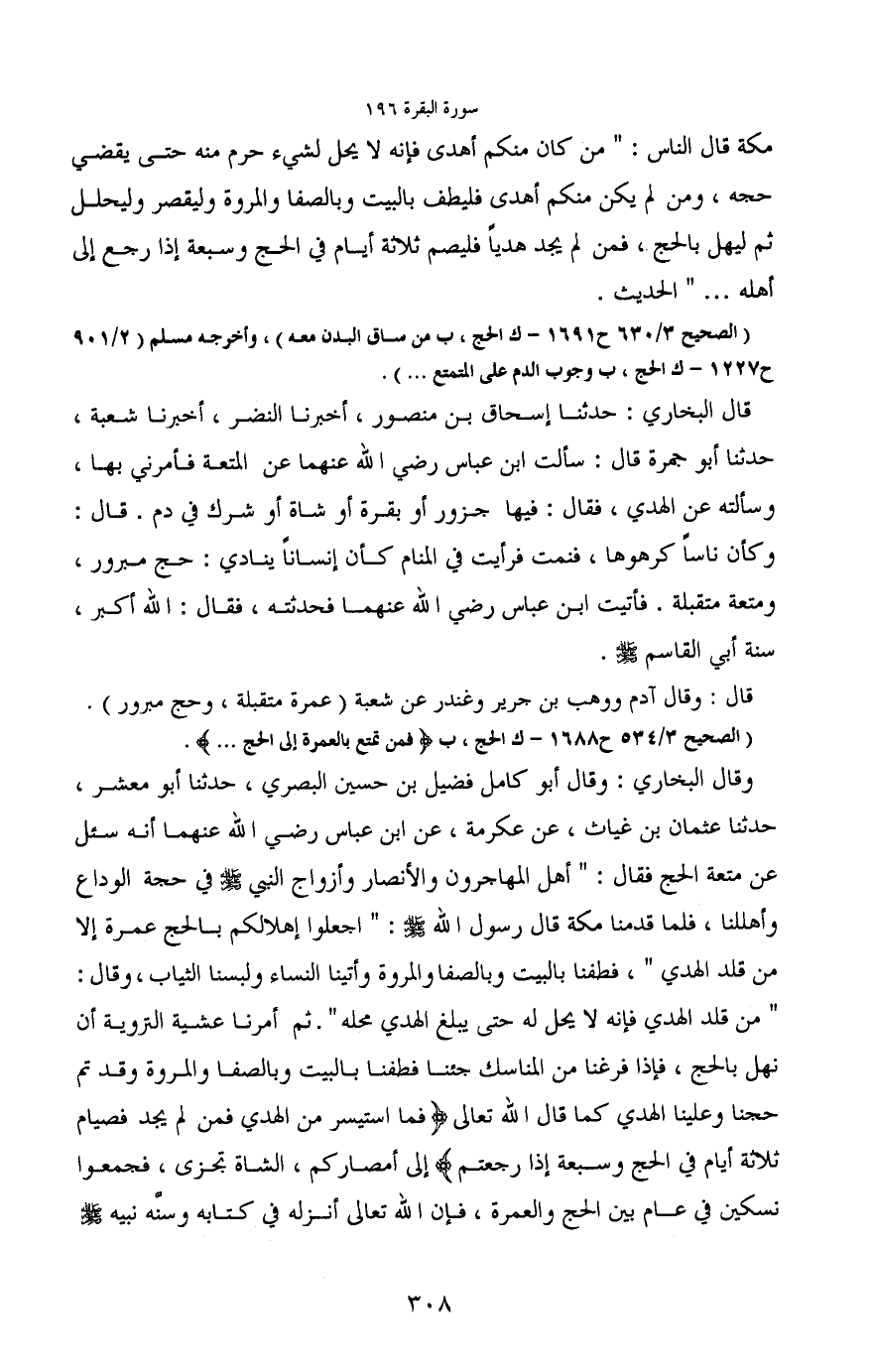 وقال البخاري: وقال أبو كامل فضيل بن حسين البصري، حدثنا أبو معشر، حدثنا عثمان بن غياث، عن عكرمة، عن ابن عباس رضي الله عنهما أنه سئل عن متعة الحج فقال: "أهل المهاجرون والأنصار وأزواج النبي - صَلَّى اللَّهُ عَلَيْهِ وَسَلَّمَ - في حجة الوداع وأهللنا، فلما قدمنا مكة قال رسول الله - صَلَّى اللَّهُ عَلَيْهِ وَسَلَّمَ -: "اجعلوا إهلالكم بالحج عمرة إلا من قلد الهدي"، فطفنا بالبيت وبالصفا والمروة وأتينا النساء ولبسنا الثياب، وقال: "من قلد الهدي فإنه لا يحل له حتى يبلغ الهدي محله". ثم أمرنا عشية التروية أن نهل بالحج، فإذا فرغنا من المناسك جئنا فطفنا بالبيت وبالصفا والمروة وقد تم حجنا وعلينا الهدي كما قال الله تعالى (فما استيسر من الهدي فمن لم يجد فصيام ثلاثة أيام في الحج وسبعة إذا رجعتم) إلى أمصاركم، الشاة تجزى، فجمعوا نسكين في عام بين الحج والعمرة، فإن الله تعالى أنزله في كتابه وسنّه نبيه - صَلَّى اللَّهُ عَلَيْهِ وَسَلَّمَ -